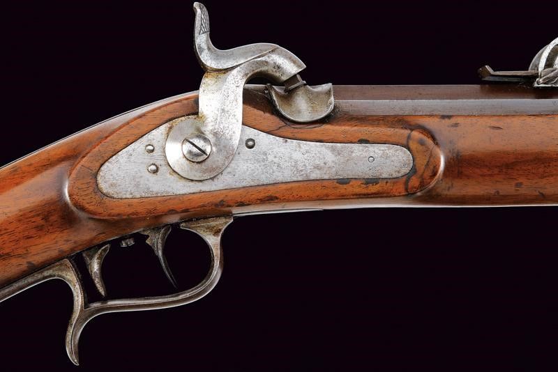 Como, lunghezza 126 cm. Metà del XIX Secolo Canna rigata (anima pulita, pitting, rigatura visibile) a due ordini, firmata 'E. MONDELLI IN COMO', ottagonale nel primo segmento e munita di alzo regolabile, in seguito tonda, con mirino e attacco per la baionetta; cal. 10 mm. La canna conserva circa il 70% della brunitura originale. Batteria a molla in avanti con cartella piatta. Cassa intera in legno con fornimenti e bacchetta in ferro. Meccanica funzionante, stecher da aggiustare.