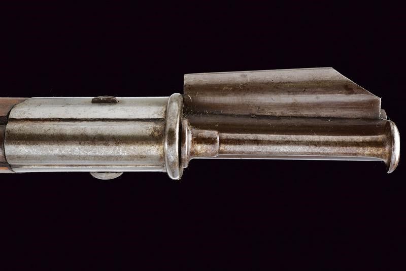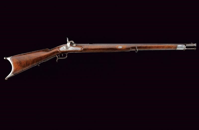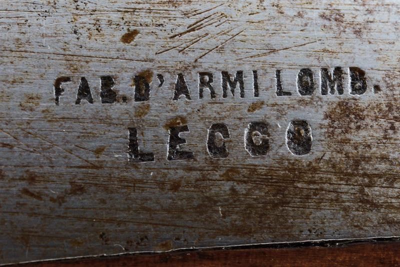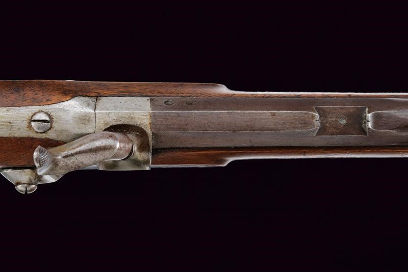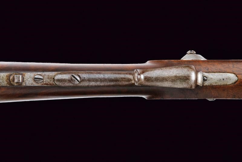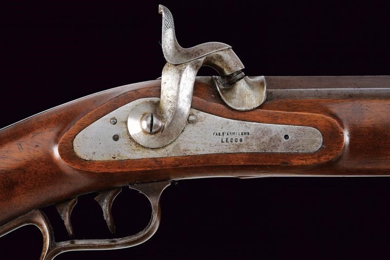 Lecco, lunghezza 127.3 cm. Metà del XIX Secolo Canna rigata (anima pulita con leggero pitting, rigatura visibile), a due ordini, la prima parte ottagonale con due punzoni (uno piemontese l'altro 'GL'), alzo mancante; in seguito tonda, mirino ed attacco per la baionetta; cal. 10 mm. Batteria a molla in avanti con cartella piatta firmata 'FAB. D'ARMI LOMB. LECCO'. Cassa intera in legno con fornimenti e bacchetta in ferro; stecher e meccanica funzionante.