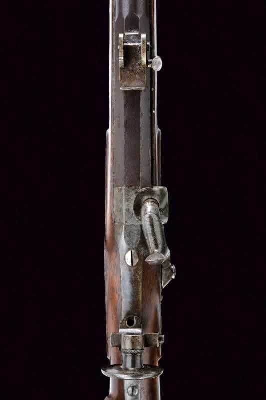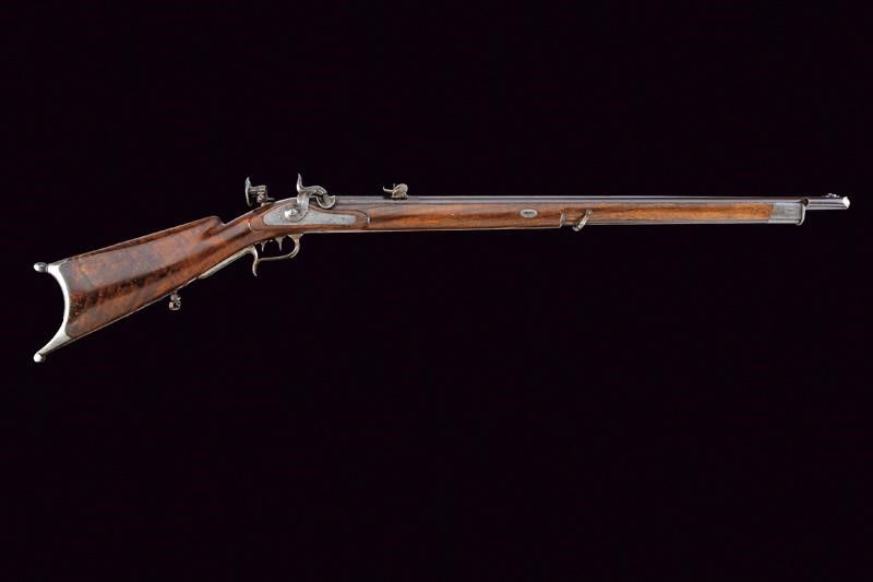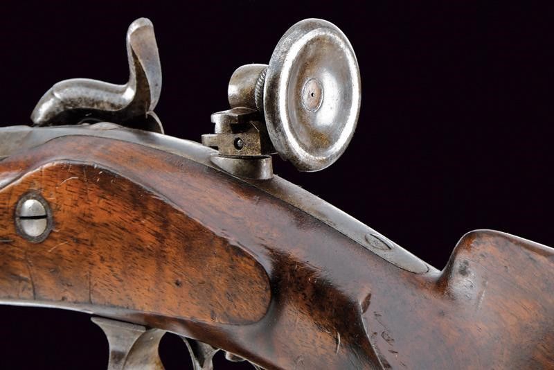 Svizzera, lunghezza 126.5 cm. Metà del XIX Secolo Canna rigata (anima con pitting, rigatura ben visibile), a due ordini; la prima parte ottagonale, firmata 'ZOLLER' e munita di alzo variabile, la seconda parte tonda, munita di mirino di precisione e con attacco per la baionetta, cal. 10 mm. Codetta con una diottra. Batteria a molla in avanti con cartella piatta; meccanica funzionante. Cassa intera in legno (piccola crepa davanti alla batteria) con fornimenti in ferro. Bacchetta mancante. Stecher funzionante.