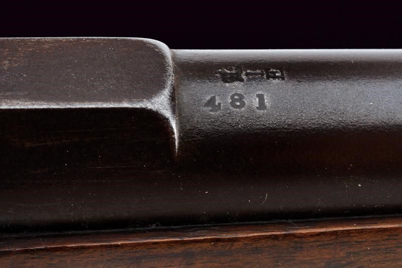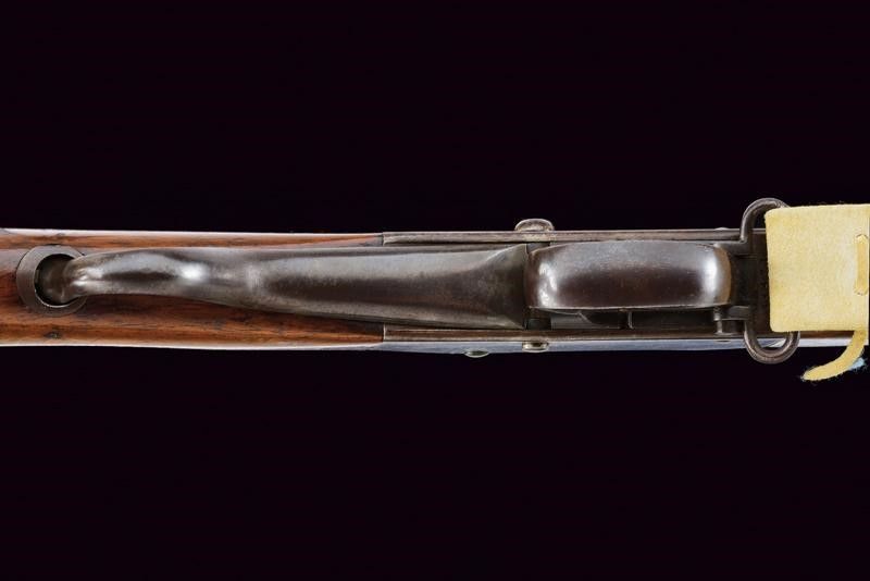 Londra, lunghezza 125.5 cm. 1875 circa Canna tonda rigata, con bindella corta alla base e diversi punzoni inglesi, alzo regolabile e abbattibile, mirino, brunitura, cal. 11 mm. Castello brunito, marcato 'W. J. JEFFERY & Co. 60 QUEEN VITTORIA St. LONDON' e munito di sicura. Calcio ed astina lunga in legno con fornimenti in ferro, il primo reggicanna con attacco per la baionetta. Meccanica funzionante. Bacchetta in ferro. Completo di baionetta (condizioni ottime) con punzoni inglesi e fodero in cuoio con fornimenti in ottone.