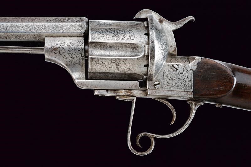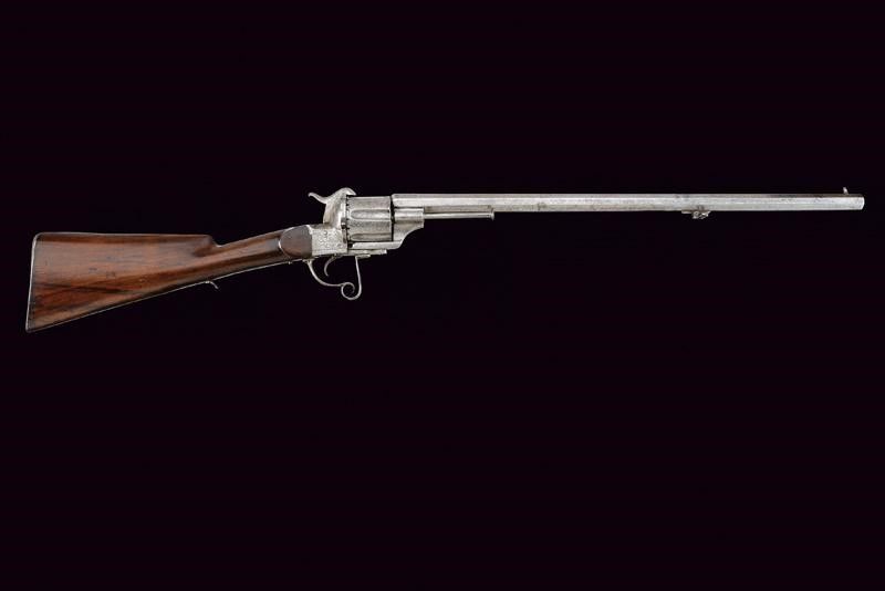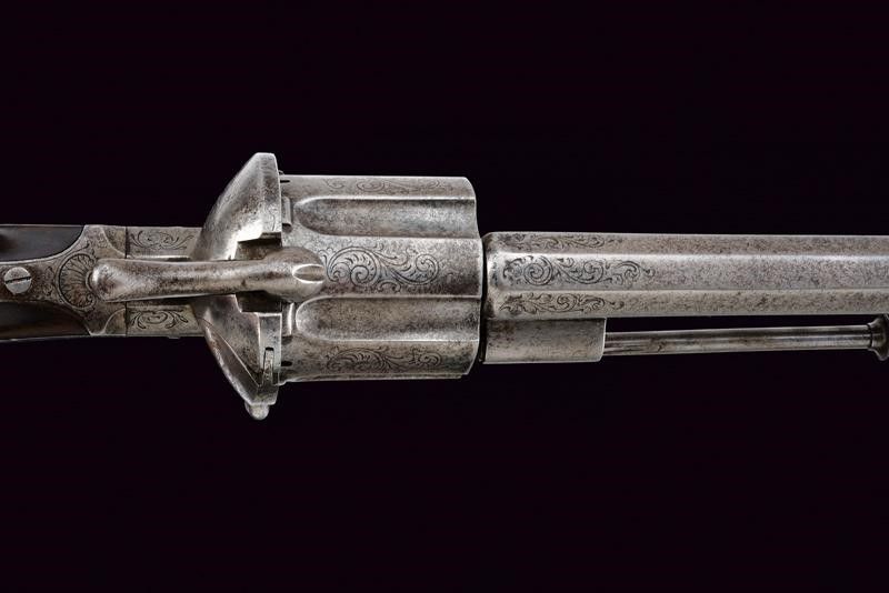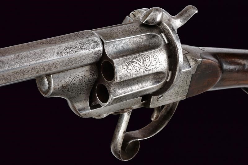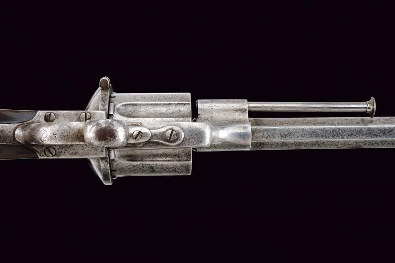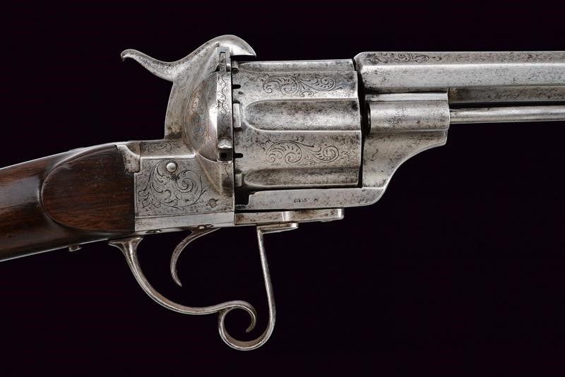 Eibar, lunghezza 107 cm. 1870 circa Canna ottagonale liscia, con incisioni floreali alla base, mirino, cal. 15 mm. Tamburo scanalato a sei colpi inciso a volute. Castello decorato en suite e marcato 'EIBAR'. Sportellino di caricamento ed estrattore. Calcio in legno. Fornimenti in ferro decorati en suite.