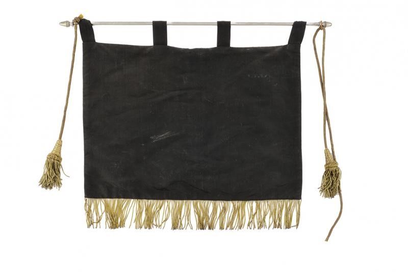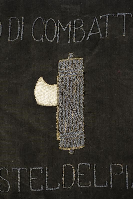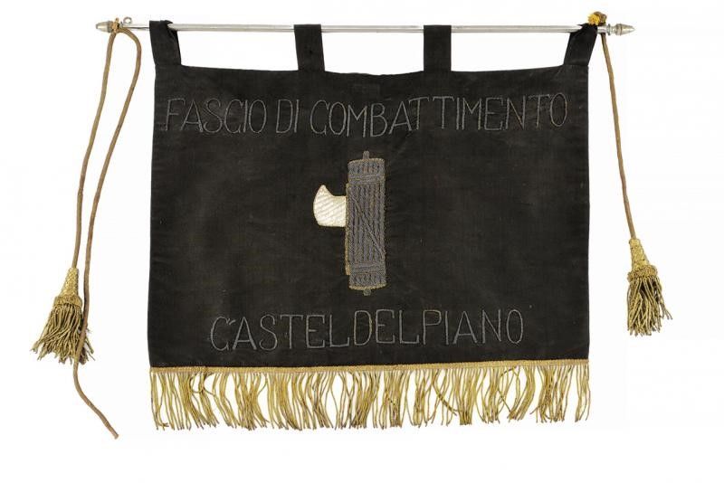 Regno d'Italia, dimensioni 56 x 46 cm. Terzo quarto del XX Secolo Di forma rettangolare, in seta nera, su una faccia fascio littorio al centro e iscrizione in canutiglia 'FASCIO DI COMBATTIMENTO CASTEL DEL PIANO'. Il bordo inferiore con frange in canutiglia. Al dorso quattro fascette di supporto con un'asta metallica decorata alle estremità con due nappe in canutiglia.