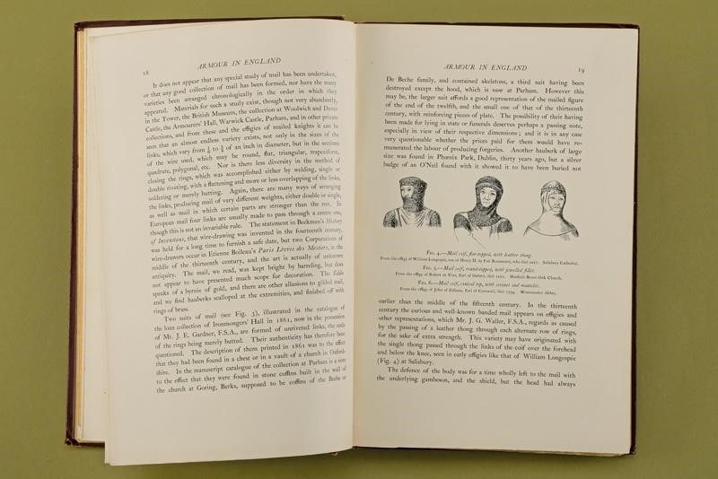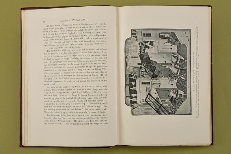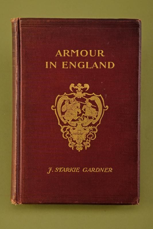 Londra, altezza 27 cm. 1897 'Armour in England'; Seeley and Co. Limited, London, 1897; in lingua inglese; diviso in due parti, la prima con titolo 'Armour made in England from the Erliest Times to the Regina of James the First' di 98 pagine con 37 illustrazioni in b/n e 8 tavole a colori, la seconda con titolo 'Foreign armour in England' di 94 pagine con 43 illustrazioni in b/n e 8 tavole colori . Copertina rigida, telata con impressioni in oro. Piccoli difetti. Raro.