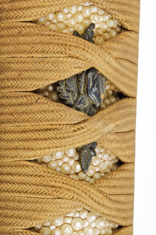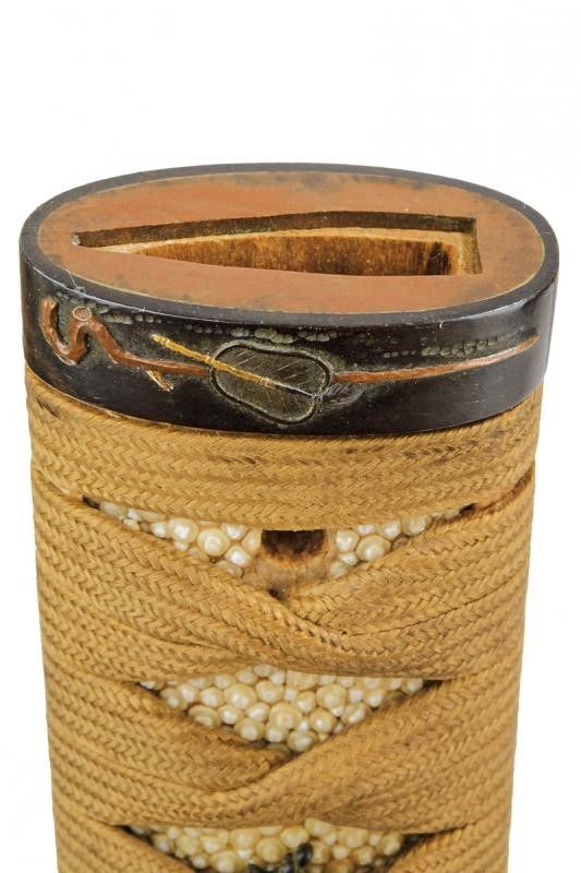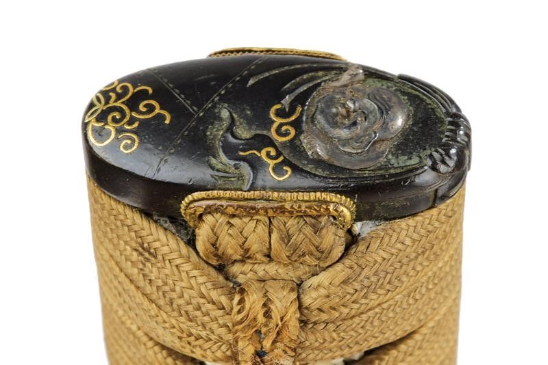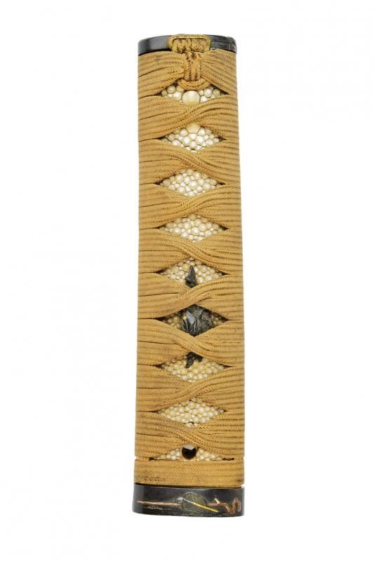 Giappone, lunghezza 12 cm. Periodo Edo (1603-1867) In legno, avvolta in pelle di razza e con tsuka-ito in morohineri-maki. Suaka (rame) Menuki decorato in oro e argento. Fuchi e kashira in shibuichi con agemine in oro e argento raffiguranti Fukurokuju.