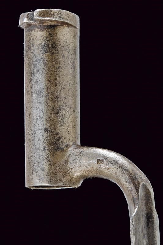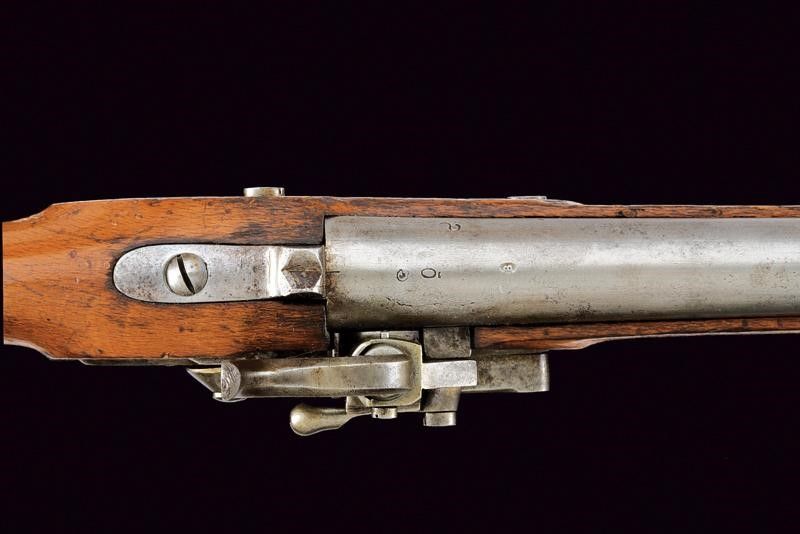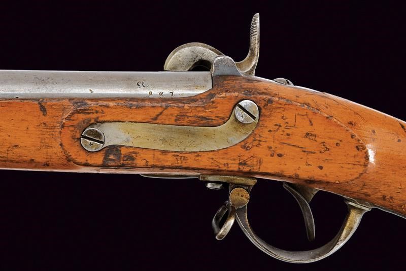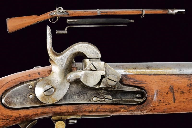 1843 Canna liscia tonda, con vari punzoni alla base, tra i quali 'B', 'O', 'S' e data '847'; mirino e dente d'innesto per la baionetta, cal. 17,6 mm. Codolo con alzo fisso. Batteria con sistema Augustin, punzone imperiale e data '843'. Meccanica funzionante. Cassa intera in legno (piccole mancanze), il lato sinistro della pala con resti di timbri. Fornimenti in ferro recanti marcature. Bacchetta in ferro. Baionetta a manicotto (lungh. 56 cm.) con lama cruciforme e punzoni alla base, completa di fodero in cuoio (probabilmente di epoca successiva) con fornimenti in ferro.