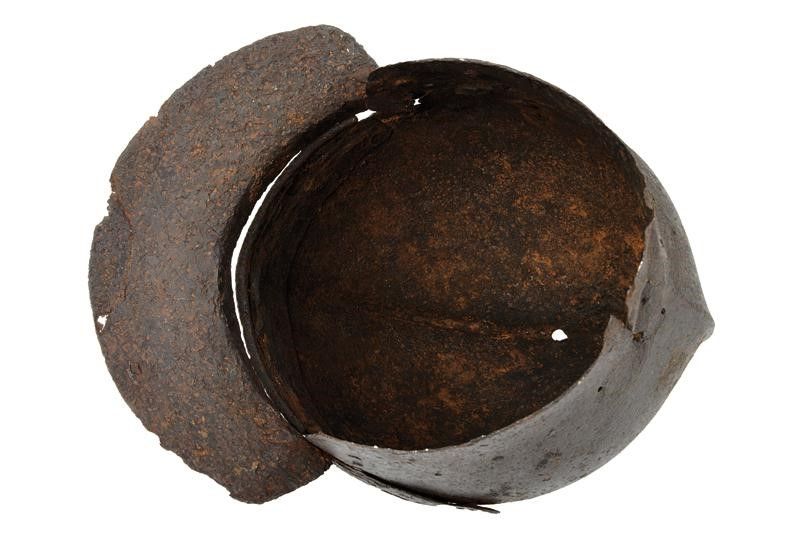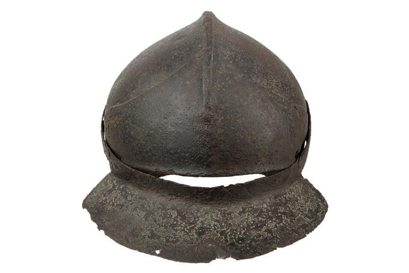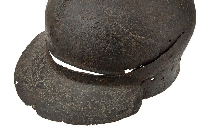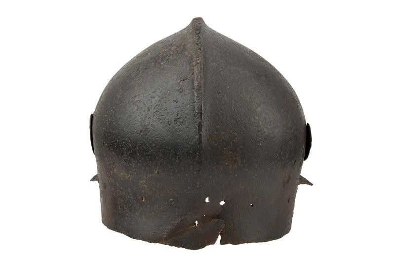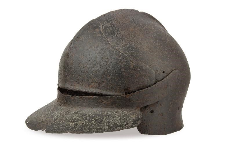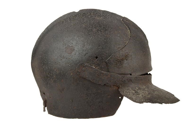 Italia, altezza 21 cm. 1480 circa Coppo in ferro lavorato in un solo pezzo con bassa cresta forata alla sommità. La parte frontale con una piastra di rinforzo rivettata, con lievissimi resti di coietti. La tesa rialzabile (forse leggermente più recente, inizio del '500) abbassata sotto al rinforzo (È probabile che abbia ricevuto un colpo dall'alto, e ora forzarla nella posizione corretta potrebbe causarne la rottura.) Alcuni danni sulla nuca e sul lato desto, piccole mancanze.