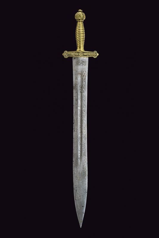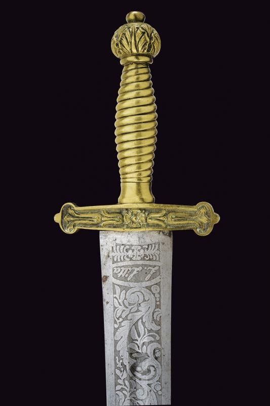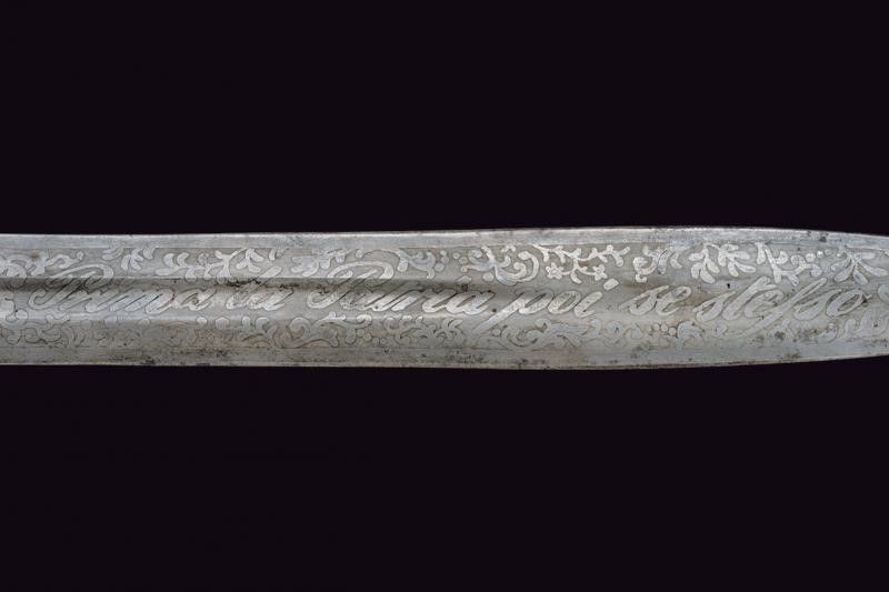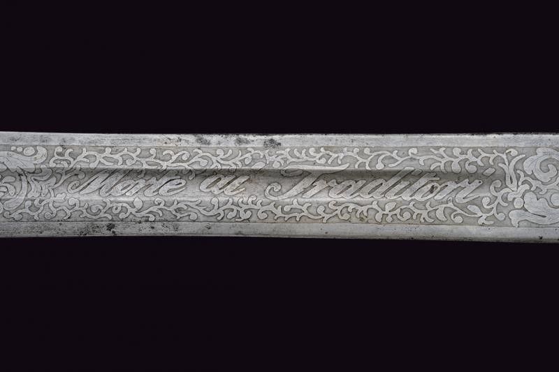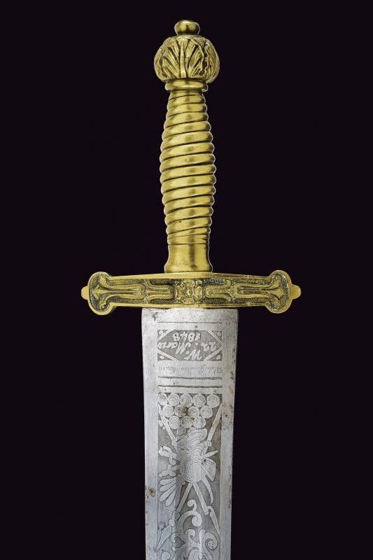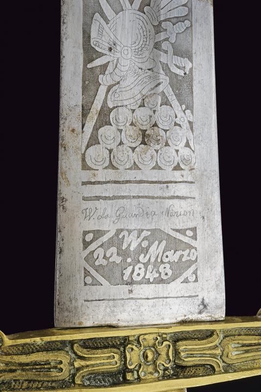 Milano, lunghezza 62.5 cm. 1848 Larga lama dritta a due fili con sguscio centrale, incisa a tutta la lunghezza. Su una faccia: 'Prima la Patria poi se stesso' fra disegni floreali, alla base 'W. 22. Marzo 1848' e in piccolo 'W. la Guardia Nazion'. Sull'altra faccia: 'Morte ai Traditori' fra racemi e firma 'L. Litta' alla base. Tipico fornimento in ottone massiccio. Raro cimelio delle famose 'Cinque giornate di Milano'.