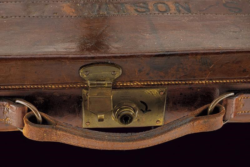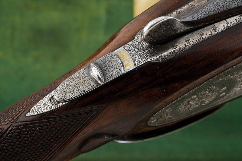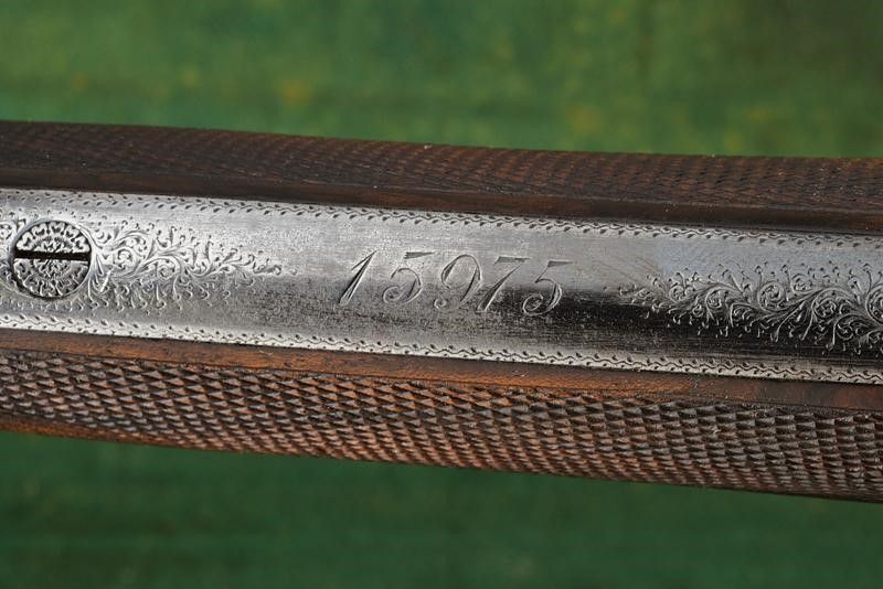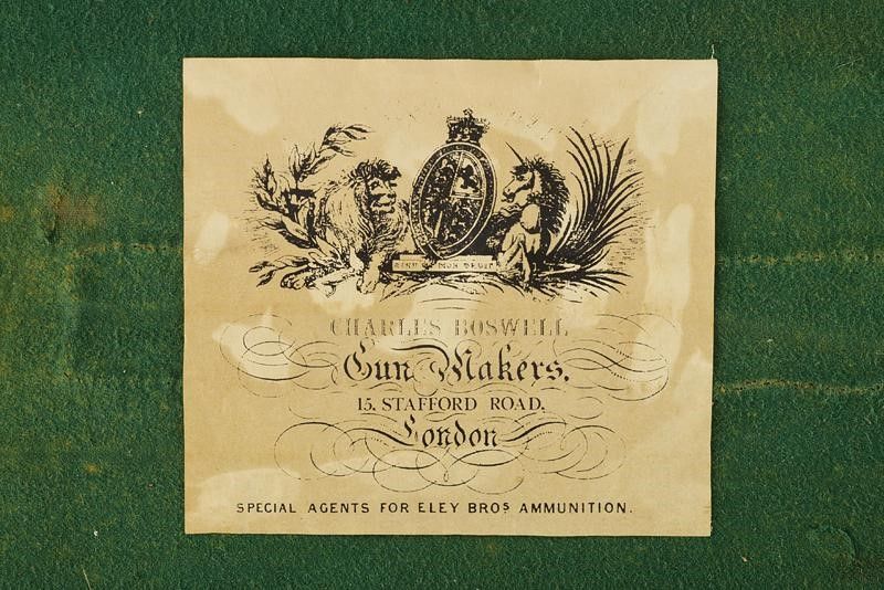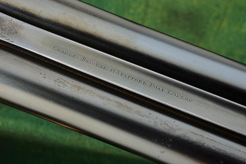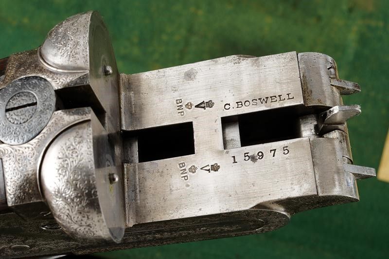Inghilterra, lunghezza 115,2 cm. 1875 - 1890 circa Canne tonde lisce da 28', con bindella recante marcatura 'CHARLES BOSWELL 15 STAFFORD ROAD LONDON'. Cal. 12. Anima in ottime condizioni. Punzoni e marcature nella parte inferiore. Castello e batterie finemente incisi a racemi. Marcatura 'C. BOSWELL' all'interno e punzoni britannici. Le cartelle firmate 'CHARLES BOSWELL'. Il codolo superiore inciso en suite e munito di sicura con marcatura dorata. Calcio in legno con collo zigrinato. Ponticello inciso en suite e con matr. '15xxx'. Spesso calciolo in legno. Astina in legno zigrinata come li calcio. In cassetta rivestita in cuoio con fodera interna in panno verde. Dentro al coperchio etichetta di Charles Boswell. All'interno anche una nota del proprietario con informazioni su canne e strozzature.