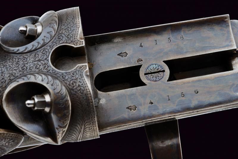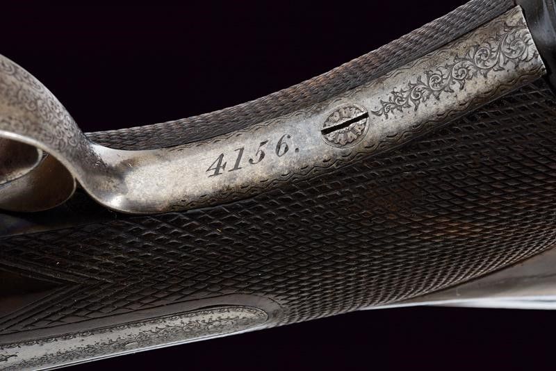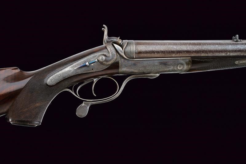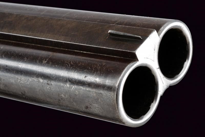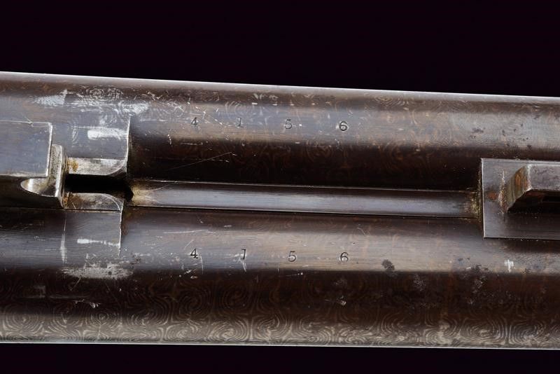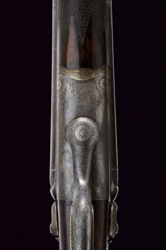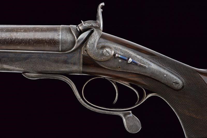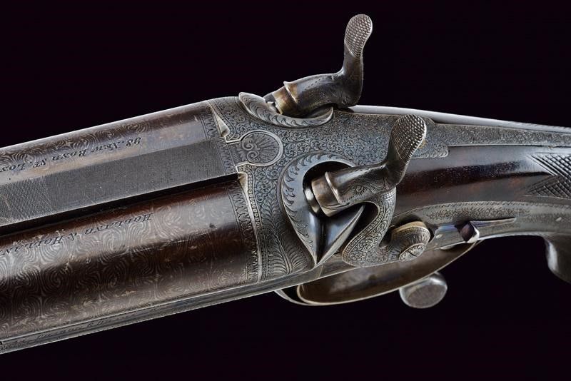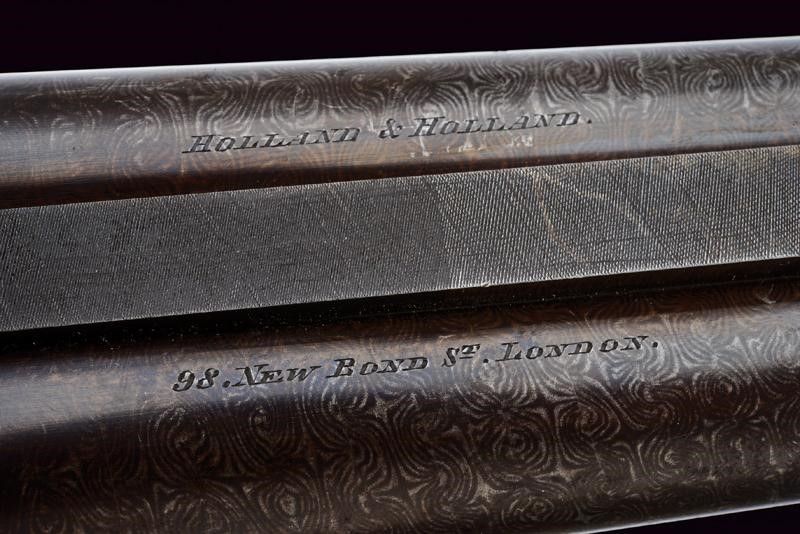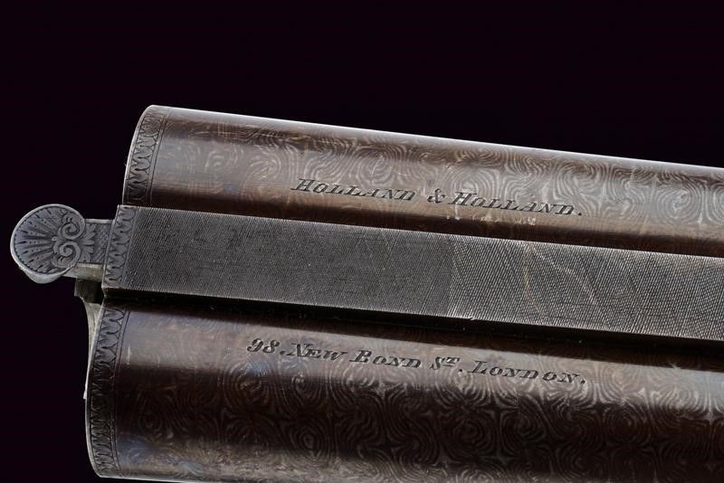 Inghilterra, lunghezza 114,4 cm. 1875 circa Pesanti canne rigate, dotate di spessa bindella zigrinata, munita di mirino e alzo fisso. Sul lato inferiore punzoni del banco di prova di Londra. Bella finitura in damasco. al dorso la marcatura 'HOLLAND & HOLLAND / 98. NEW BOND STREET LONDON'. In volata cal. 18 mm (!) La bascula con fini incisioni a racemi e con dicitura sul fianco sinistro 'CHARGE 6 DRAMS- CASE 2 5/8 INCHES.' Le batterie incise sempre a racemi e recanti cartiglio 'HOLLAND & HOLLAND', munite di sicura esterna con resti di brunitura azzurrata. Cani a due scatti. Meccanica ben funzionante. Calcio a pistola con coccia in ebano o corno. Collo ed astina zigrinati. Bella marezzatura del legno sulla pala. In basso scudetto monogrammato. Fornimenti in ferro incisi en suite.
