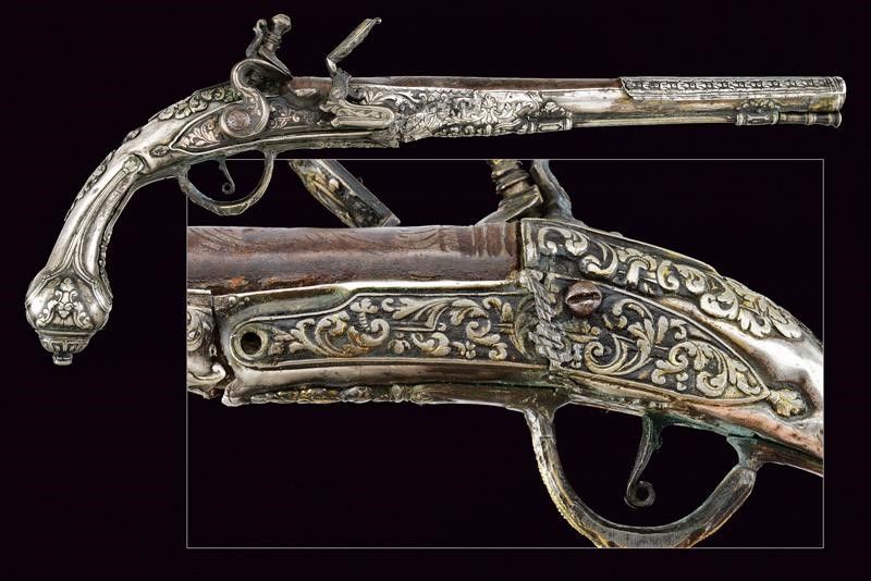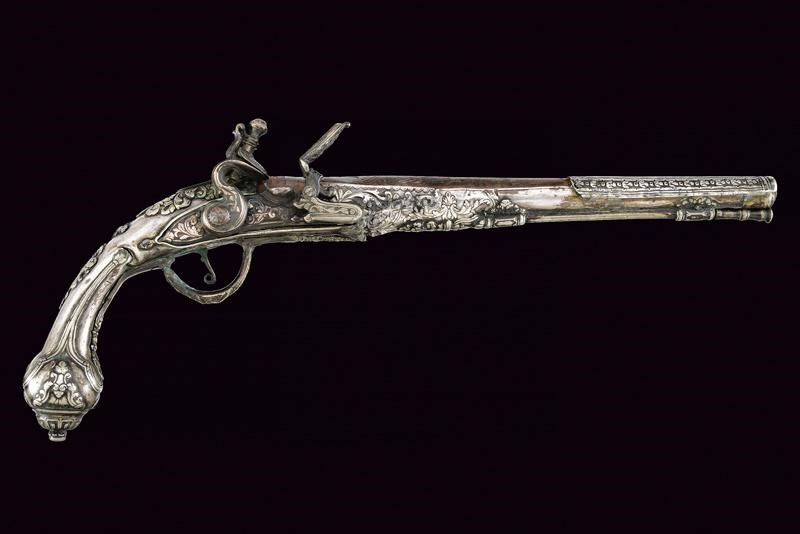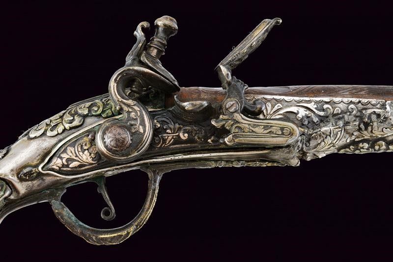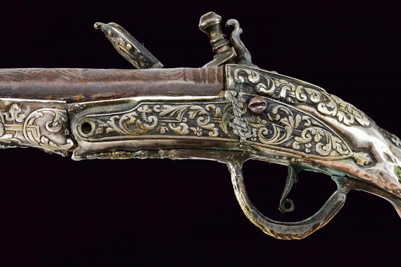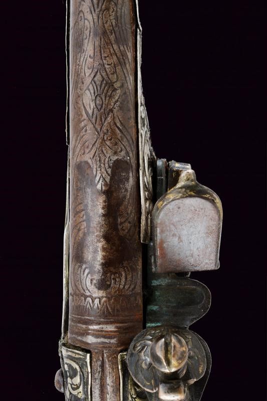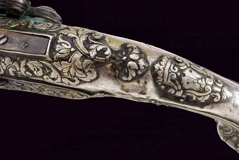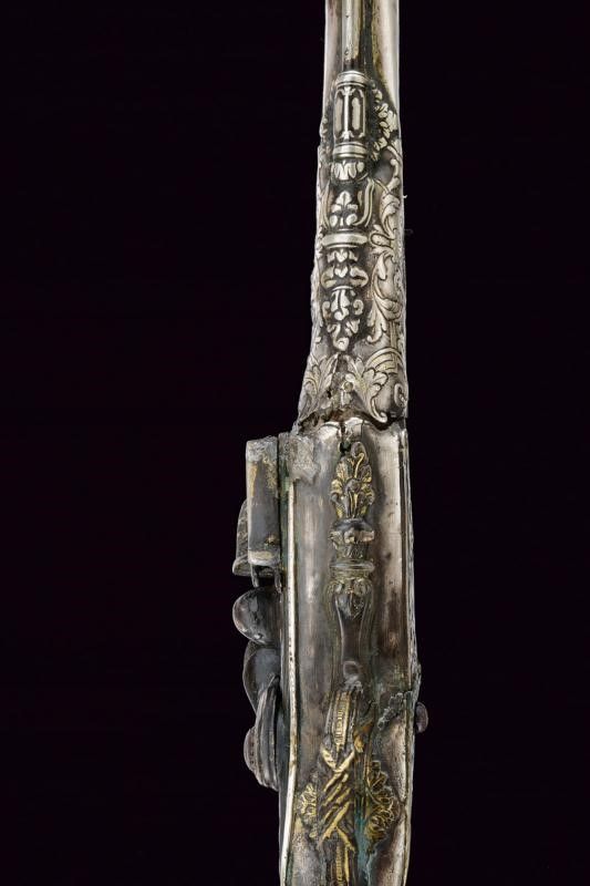Europa orientale, lunghezza 40 cm. fine del XVIII Sec. Canna tonda, liscia, con cornicette scanalate ed incisioni a fogliame sulla culatta; batteria con cartella leggermente bombata, con riporti in rame e argento intagliati a motivi floreali; molla del copriscodellino protetta da placchetta in argento; cassa intera (in argento?) con decori cesellati in bassorilievo a fogliame, dorso dell'impugnatura con scudetto coronato; ponticello, contropiastra e bacchetta sempre argentati. Alcune vecchie riparazioni, vite della batteria mancante.
