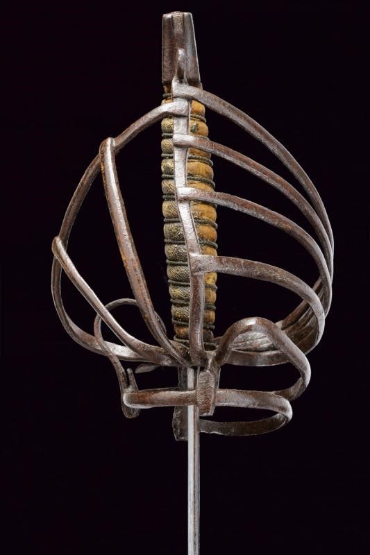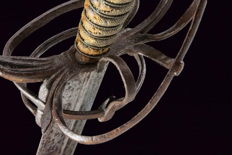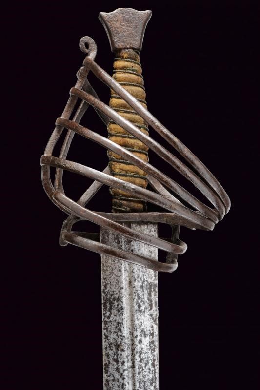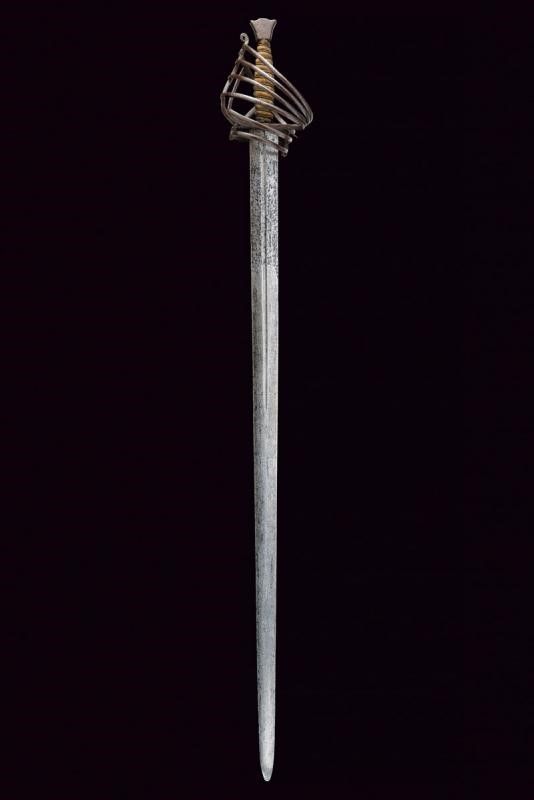 Veneto, lunghezza 123 cm. XVII Secolo Ampia lama dritta a due fili, sgusciata al centro nel primo segmento, in seguito di sezione lenticolare. Fornimento con raro tipo di gabbia munito di piccolo ponticello e anello per il pollice. Pomo a testa di gatto in ferro con marcatura. Impugnatura in legno a spire con resti di rivestimento in pelle di pesce e trecciola metallica.