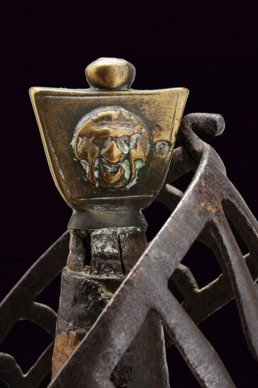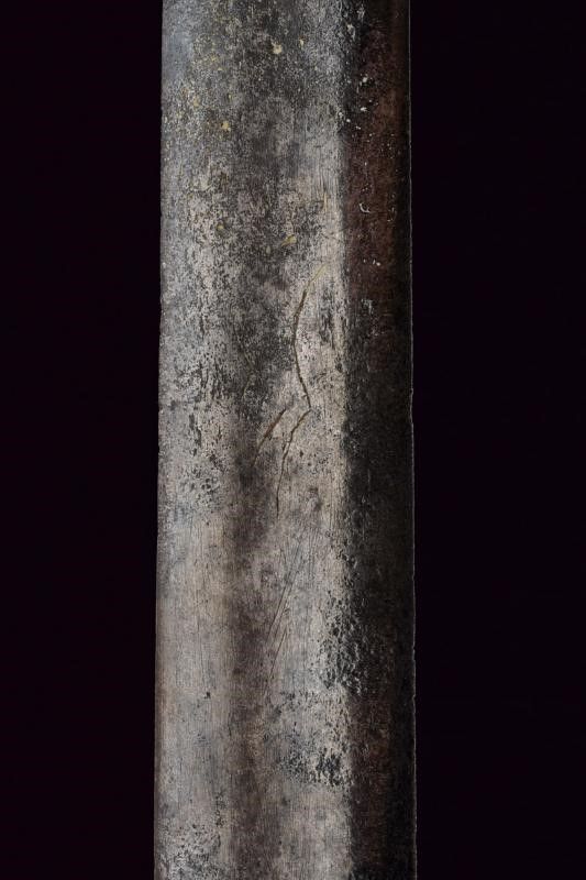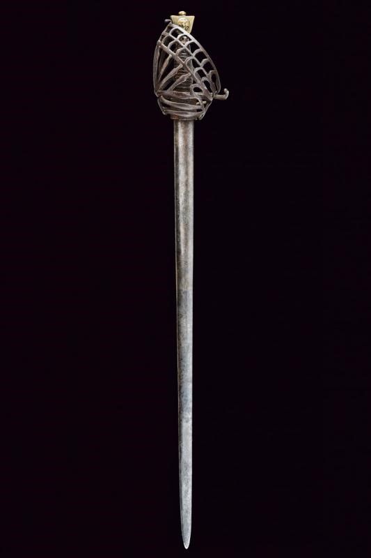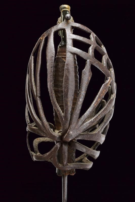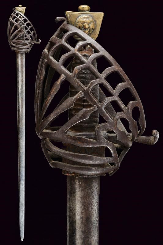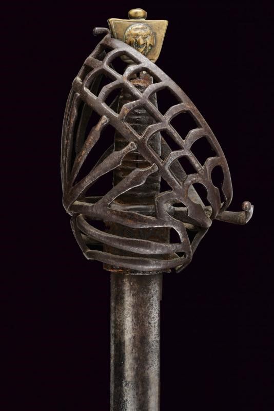 Veneto, lunghezza 104.5 cm. XVII Secolo Lama dritta a due fili di sezione lenticolare, lievemente sgusciata alla base e recante il Lupo di Passau. Il tallone rivestito di cuoio. Fornimento in ferro a gabbia con anello da pollice. Pomo a testa di gatto con fregio a testa di leone in rilievo al centro. Impugnatura in legno rivestita di cuoio (mancanze). Rara.