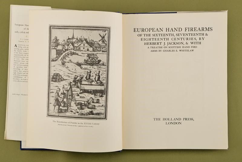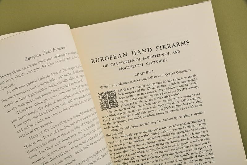 1959 'European Hand Firearms'; The Holland Press, London, 1959; 108 pagine testo e con illustrazioni in b/n su 63 tavole. Copertina rigida in tela con sovracopertina originale (leggermente danneggiata).