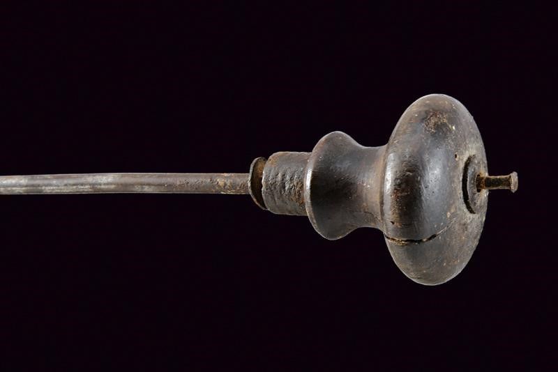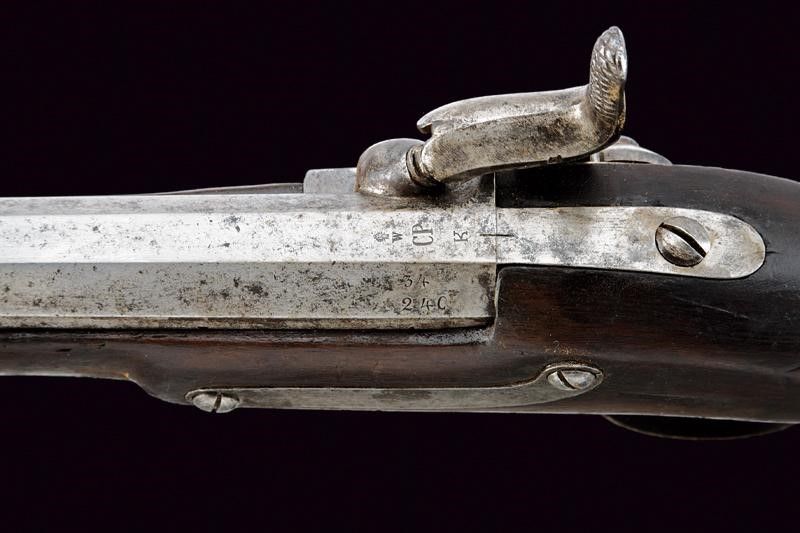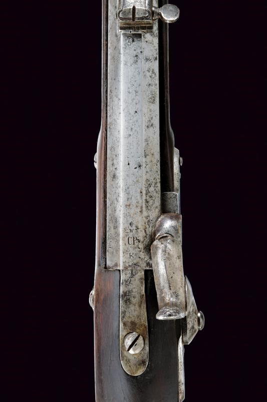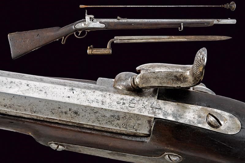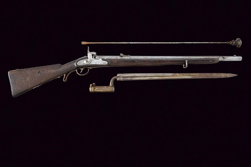 1854 Canna ottagonale rigata (anima pulita, leggero pitting in qualche punto, rigatura visibile) con volata cilindrica, base marcata 'CP', 'K', 'W', '34', '240' e con altre marcature ai lati, dotata di alzo regolabile, mirino e dente di innesto per la baionetta, cal. 13.9 mm. Batteria a luminello a molla in avanti, cartella con data '854' e punzone imperiale. Cassa intera in legno (segni d'uso e del tempo) con fornimenti in ferro in patina, calciolo marcato 'V. L. V. D. 3531'. Completo della sua baionetta, con marcatura '4 C 6 1', lunghezza: 70,9 [cm]. Con bacchetta in ferro dotata di battipalla e pomo in legno.