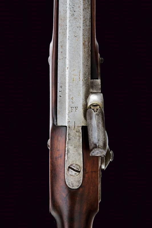 1855 Canna ottagonale rigata (anima pulita, rigatura ben visibile) con volata cilindrica, base marcata 'F.F', '279', 'W' al di sotto punzone imperiale e altri punzoni laterali; alzo regolabile, mirino e dente di innesto per la baionetta, cal. 13.9 mm. Batteria a luminello a molla in avanti, cartella con data '855' e punzone imperiale. Cassa intera in legno con fornimenti in ferro, calciolo marcato con matricola coeva. Con bacchetta in ferro dotata di battipalla con anello in ottone e pomo in legno.