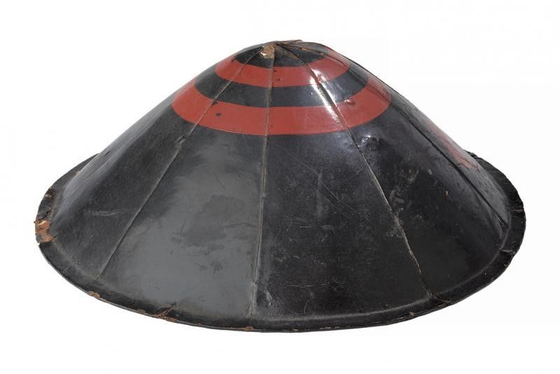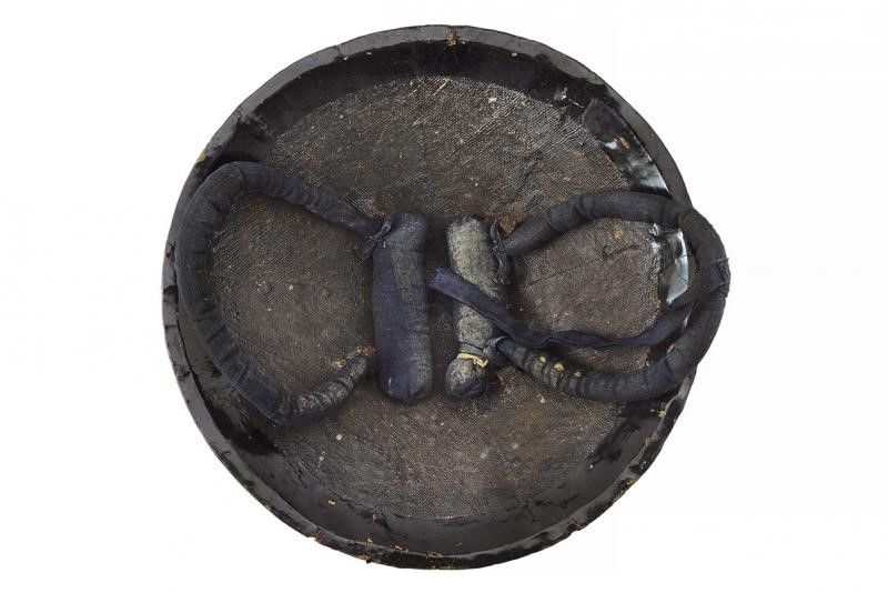 Giappone, diametro 35 cm. Periodo Edo (1603-1867) Composto da otto lame in ferro, con superficie esterna laccata Urushi in color nero, stemma rosso Maru-ni-Konoji-hishi-mon sul davanti e due cerchi concentrici rossi in alto. L'interno con lino laccato, completo di futon e lacci. Difetti e mancanze generali. In questa tipologia utilizzato dagli Ashigaru Teppo-tai (Moschettieri).