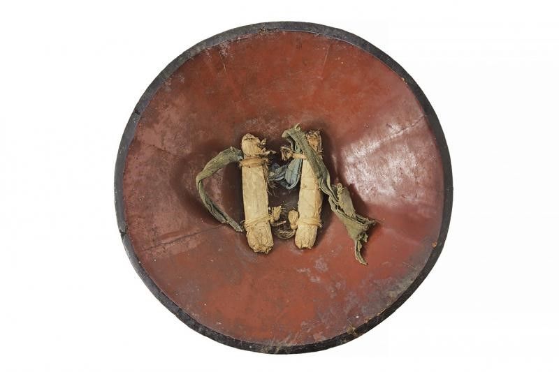 Giappone, diametro 36.4 cm. Periodo Edo (1603-1867) Di forma conica, composto da otto lame in ferro, e laccato in color nero Urushi (mancanze), con stemma rosso Maru-ni-Ichimai-imokashiwa-mon sulla parte anteriore. L'interno con finitura laccata rossa e completo di futon e lacci.Utilizzato dagli Ashigaru Teppo-tai (moschettieri).