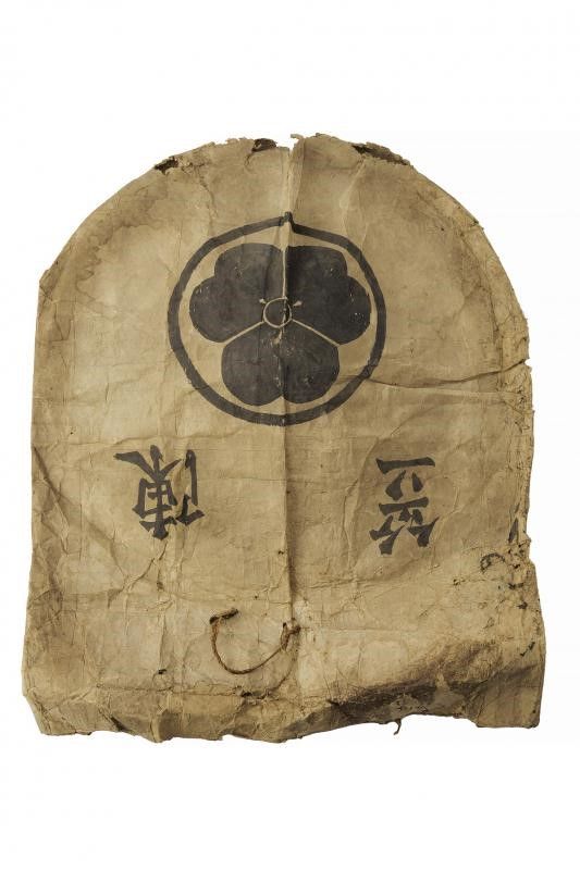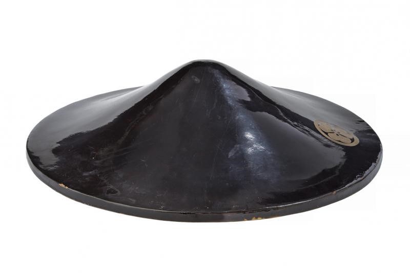 Giappone, diametro 40 cm. Periodo Edo (1603-1867) Struttura Kanshitsu laccata nera, Maru-ni-Katabami-mon sul davanti. L'interno ha una finitura laccata marrone chiaro ed è completo dei lacci originali. Dotato di una borsa di carta originale contrassegnata con 2 Kanji, 'Jingasa', e uno stemma di famiglia abbinato. Raro con la sua borsa.