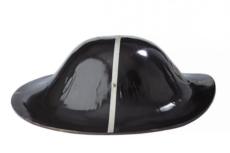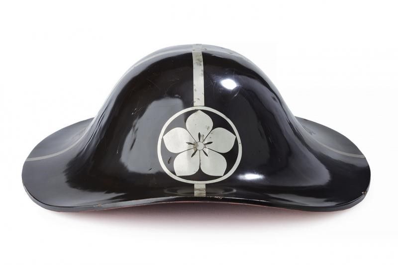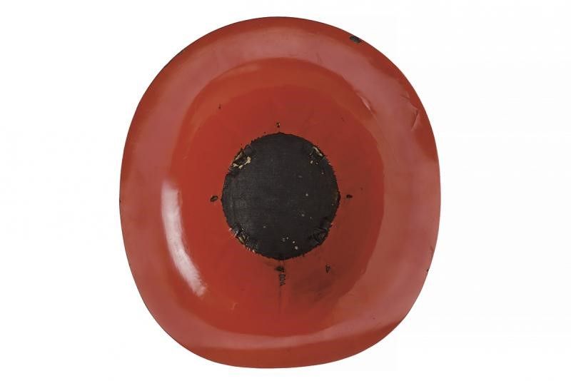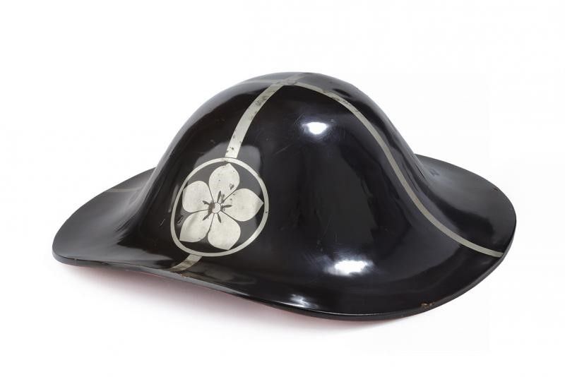 Periodo Edo (1603-1867) Di forma convessa, in lacca nera ornata da linee in argento disposte a croce, mon sulla parte frontale e tesa rialzata. Interno a lacca rossa.