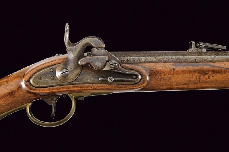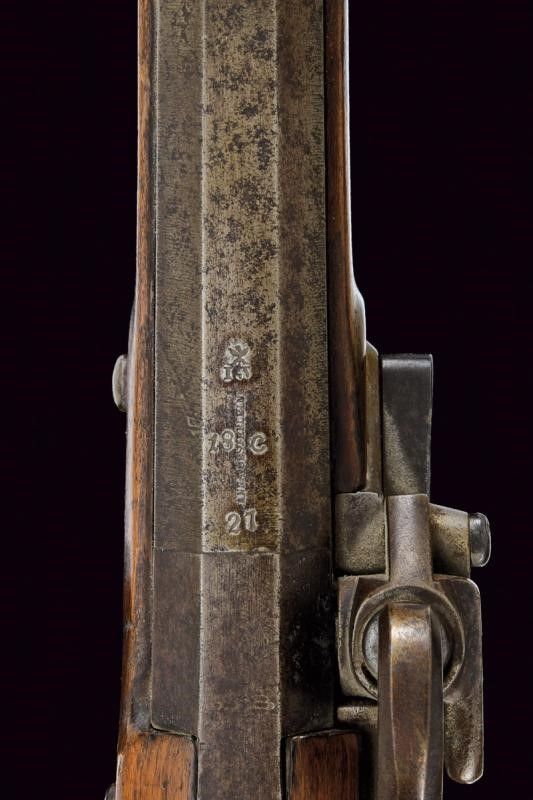 1854 Canna rigata a due ordini, tonda e ottagonale, con base marcata 'ANNA OESTERLEIN', '18C. 27' e con vari punzoni, dotata di mirino, alzo abbattibile, dente d'innesto per baionetta, cal. 18 mm. Batteria con sistema Augustin e cartella datata '854' e con punzone imperiale, cane punzonato 'J'. Cassa intera in legno, ponticello e coccia in ottone, reggicanna e bacchetta in ferro.
