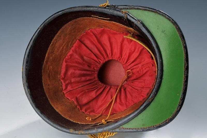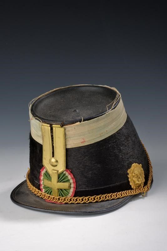 Regno d'Italia, altezza 15.5 cm. Terzo quarto del XIX Secolo Coppo in feltro nero con imperiale e visiera in cuoio, sulla fronte graffa in metallo con croce sabauda caricata su coccarda tricolore in tessuto; completo di catenella su fornimenti a testa di leone; una terza testa anche nella parte posteriore. Sul bordo superiore largo gallone in tessuto bianco. L'interno con alluda in pelle e cuffia in tessuto rosso.