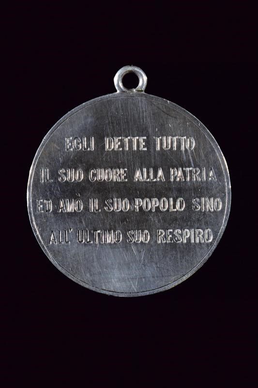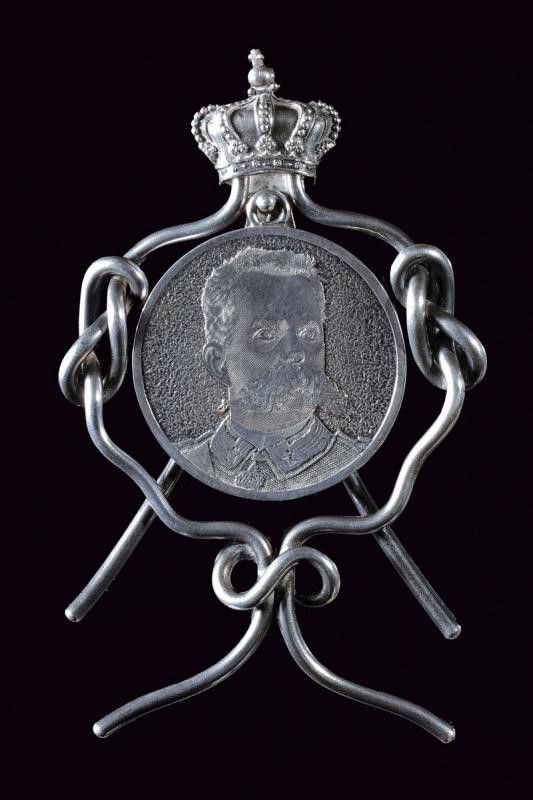Regno d'Italia, altezza 9.8 cm. ultimo quarto del XIX Sec. Medaglia in argento recante al dritto bella raffigurazione di Re Umberto I con collare della Santissima Annunziata, al verso con: 'EGLI DETTE TUTTO IL SUO CUORE ALLA PATRIA ED AMO' IL SUO POPOLO SINO ALL'ULTIMO SUO RESPIRO'. Posta su bella cornice in argento sormontata da corona, e dotata al centro di bottoncino di sostegno per la medaglia; il bordo intrecciato a nodi sabaudi. Interessante.