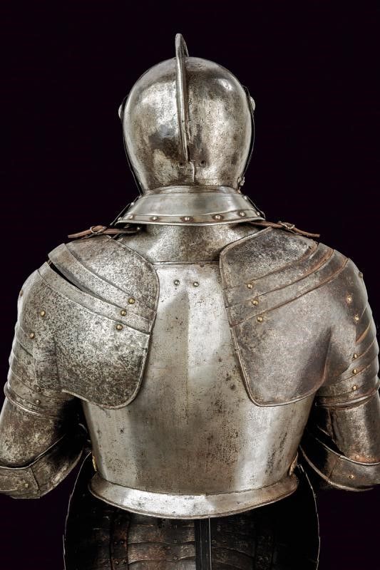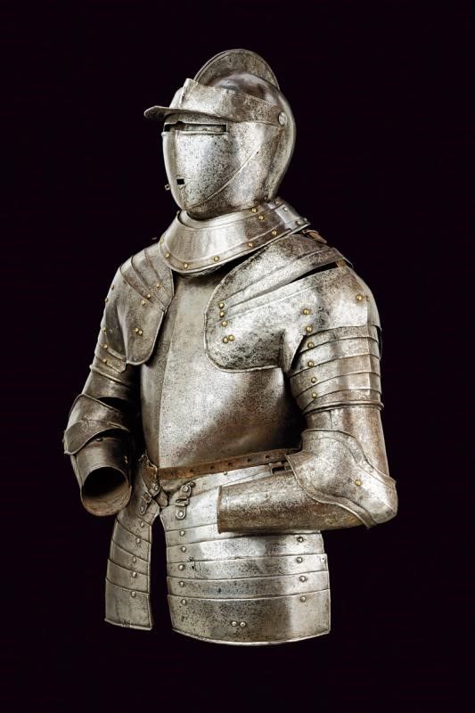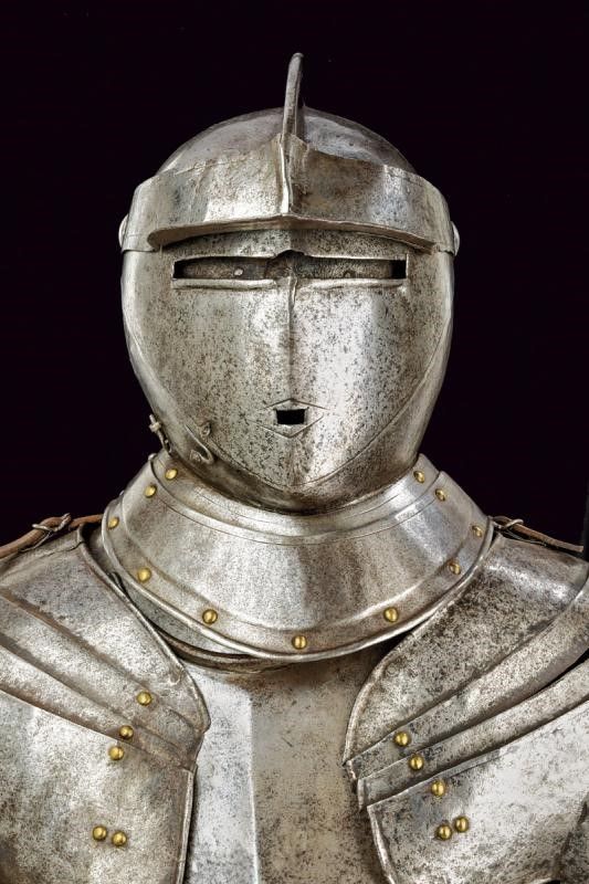 Europa, altezza 125 cm. inizio del XVII Sec. Con elmetto chiuso da corazza, coppo in due metà; frontale rialzabile con tesa appuntita e con margine a lista ribassata; ventaglia con fessure oculari (una mancanza al centro), un altro foro d'aerazione all'altezza della bocca; barbozza; due lame di gronda (una di restauro) e due di guardacollo, quelle più esterne con giro di ribattini. Petto costolato, schiena liscia scanalata al centro. Goletta a due lame. Spallacci a otto lame lisce, con ribattini in ottone. Bracciali dotati di cubitiere costolate e con piegature; antibracci a due lame. Scarselle formate da sei piastre, le ultime ribadite. I bordi con cordonature lisce.