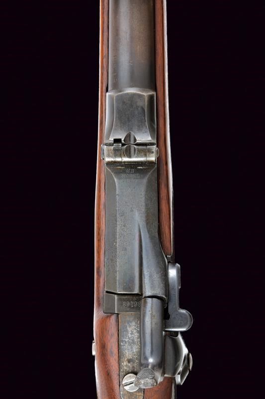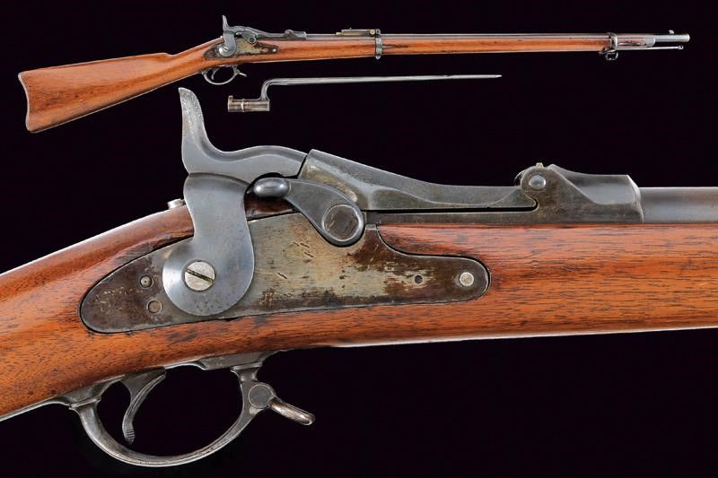 USA, lunghezza 132 cm. 1884 Canna tonda rigata (anima in buono stato e rigatura ancora visibile), con mirino, alzo abbattibile e regolabile, resti di punzoni quali 'V', 'P' e una testa d'aquila, calibro 45/70. Blocco dell'otturatore marcato 'U.S. MODEL 1884'. Codolo con matricola '391xxx'. Tracce di vecchia finitura. Batteria a molla in avanti con cartella liscia. Cassa intera in legno. Fornimenti in ferro. Ponticello e relativa base in due pezzi. Calciolo marcato 'US' e con serbatoio. Gli elementi in ferro preservano gran parte della brunitura. Bacchetta in ferro. Completo della baionetta a ghiera marcata 'US'.
