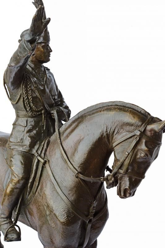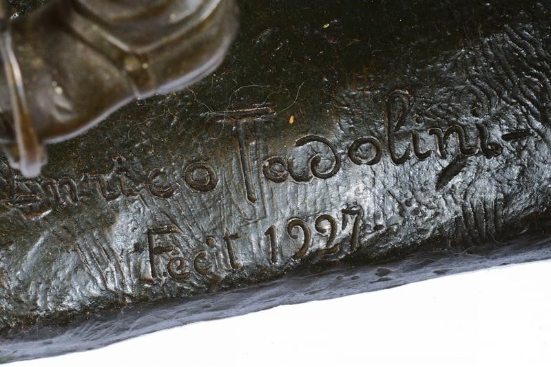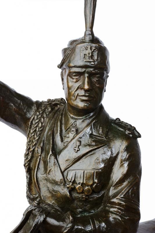 1927 Pregevole statua equestre del Duce. Raffigurazione in uniforme con Fez, il braccio sollevato nel saluto romano. Finissima esecuzione con gran cura dei dettagli. La base firmata 'Enrico Tadolini Fecit 1927'.