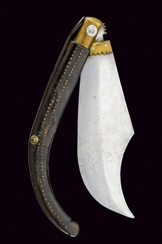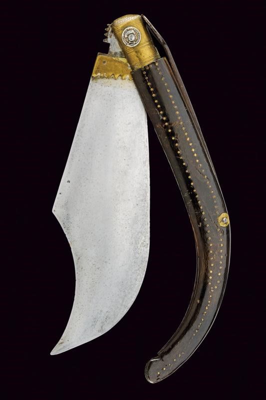 Spagna, lunghezza (open) 53.5 cm. Terzo quarto del XIX Secolo Larga lama a un filo e controfilo con punta incavata, la base rinforzata con placche in ottone. Impugnatura incurvata in corno (piccoli difetti) decorata con chiodini e con ghiera in ottone, quest'ultima incisa e ornata da due monete spagnole, una del '1848' e una del '1860'. Molla in ferro sul dorso.