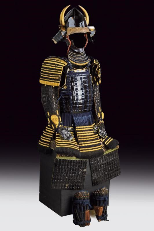 Giappone, altezza as shown circa 155 cm. Periodo Edo (1603-1867) Shiinomi-nari (conoide) Kabuto, in ferro laccato di nero. Mabizashi (visiera) dorato con finitura Tatakinuri. Fukigaeshi con mon della famiglia 'Maruni-karahana'. Shikoro con cinque lame Kiritsuke-kozane (piastre intagliate). Sui lati due Wakidate originali in legno sagomati a forma di corno di bufalo, staccabili e trattenuti in sede da una molla. Completo di Hanbo laccato di nero. Yodare-kake a cinque piastre dorate con allacciatura Kebiki-odoshi in color blu. Nimai-do (pettorale in 2 pezzi) in ferro laccato di nero. Kiritsuke-iyozane a otto piastre sul davanti con lacci in color blu. Fukurin rifinito in ottone. Kusazuri con cinque piastre en suite. Completa di Sode, Kote, Haidate e Suneate. Supporto e scatola non inclusi.