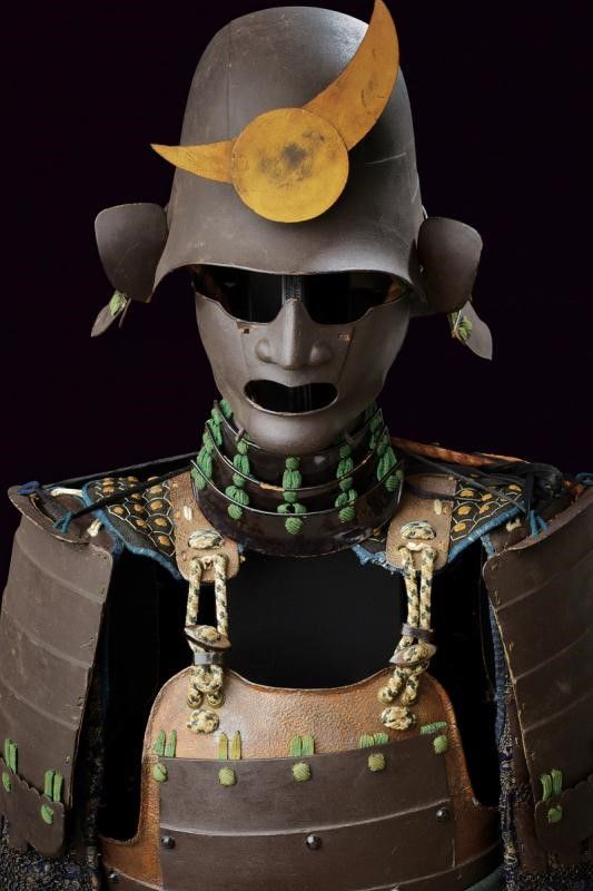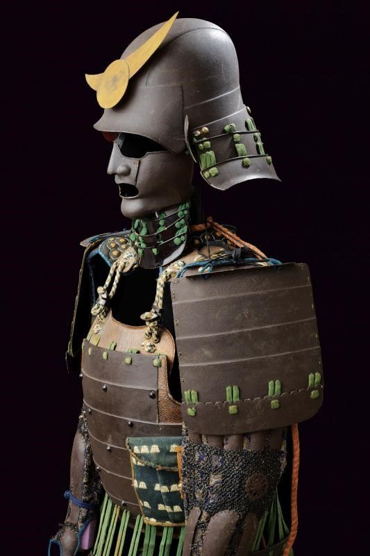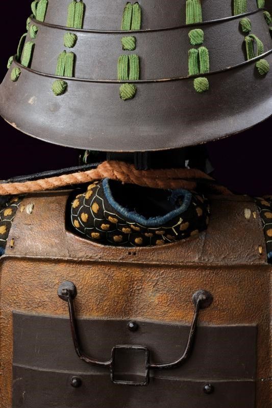 Giappone, altezza as shown circa 155 cm. Periodo Edo (1603-1867) Kabuto Zu-nari (a forma di testa) in stile Hineno in ferro laccato con finitura color ferro arrugginito. Shikoro con tre piastre. Maedate in legno dorato a forma di sole e luna. Ryubu Menpo decorato en suite. Suga con quattro piastre laccate di nero in Moegi (giallo verdastro) con lacci Sugake. Okegawa Nimai-do (corazza in 2 pezzi) in ferro con la stessa finitura. Sei piastre Itazane rivettate. Un Hanagamibukuro (tasca) in tessuto sotto l'ascella sinistra. Kusazuri con quattro piastre (en suite con il Menpo). Completo di Sode, Kote, Haidate e Suneate, che sono anche abbinati. Supporto e scatola non inclusi.