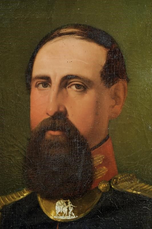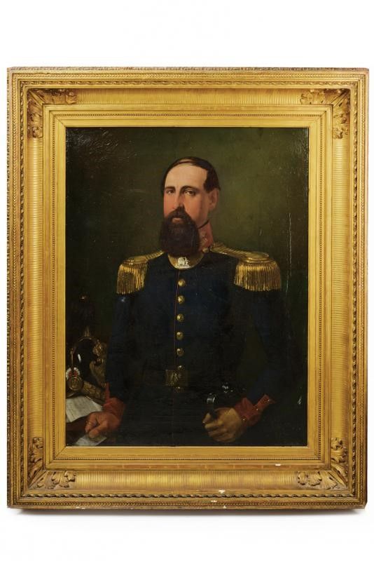 Granducato di Toscana, dimensioni 103.5 x 124 cm. Metà del XIX Secolo Pregiata raffigurazione di un ufficiale della Guardia Civica (epoca Leopoldo II) in uniforme, con spalline, gorgiera, cintura e sciabola; sul lato sinistro è visibile l'elmo della Guardia Civica. In bellissima cornice contemporanea al dipinto, riccamente stuccata e dorata.