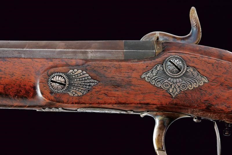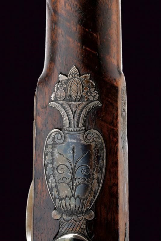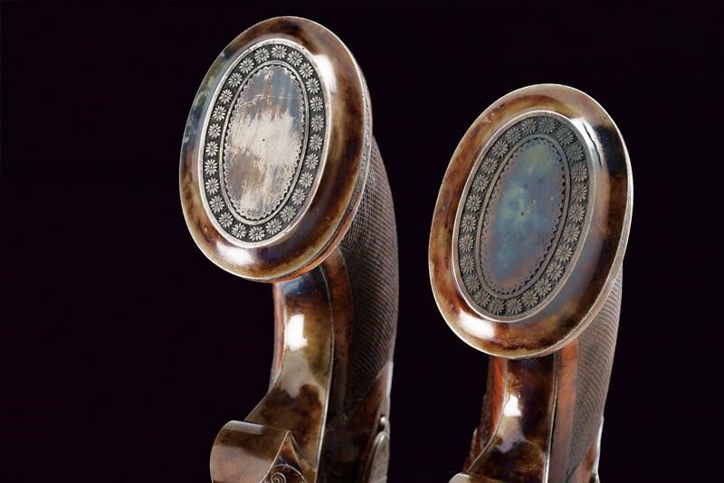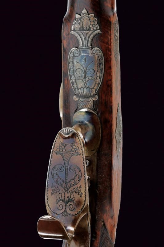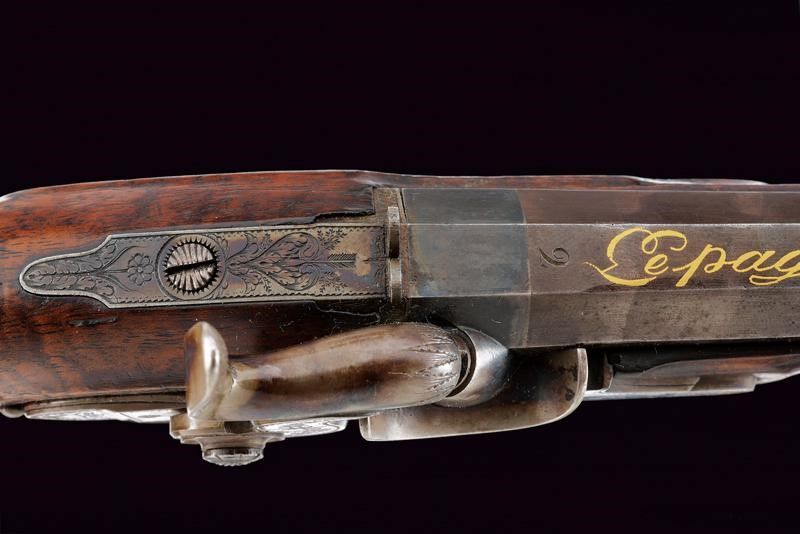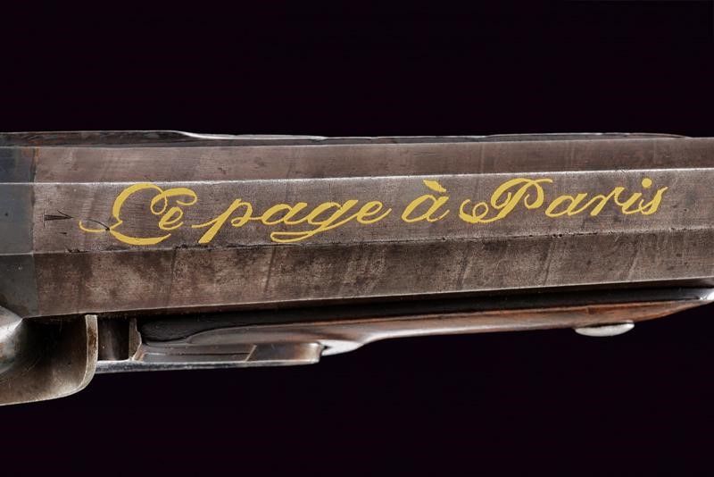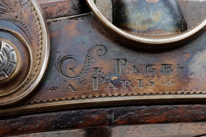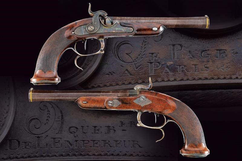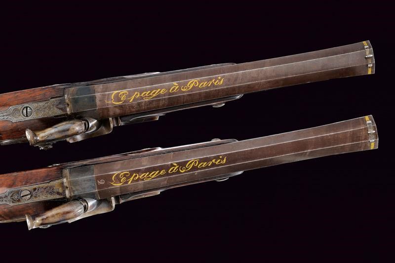 1855 Canne ottagonali, microrigate (anime pulite, rigatura visibile), brunite e damascate, firmate 'Le Page a Paris' in oro e numerate '1' e '2'. Le volate leggermente strombate, decorate con una cornice in oro e munite di mirino di precisione, cal. 13 mm. Codette finemente incise con una freccia, un cuore e disegni floreali, munite di alzo. Batterie a molla in avanti firmate ' LA PAGE A PARIS / AQUEB.ER DE L'EMPEREUR'; cartelle e cani con cornicette ai bordi e incisioni a motivi floreali. Casse in legno con calci micro-zigrinati. Bellissimi fornimenti in ferro brunito finemente incisi. Ponticelli recanti cornucopie e decori a tema floreale, muniti inoltre di poggiadito. Grilletti con stecher. Meccanica funzionante. Da cassetta quindi prive di bacchetta.