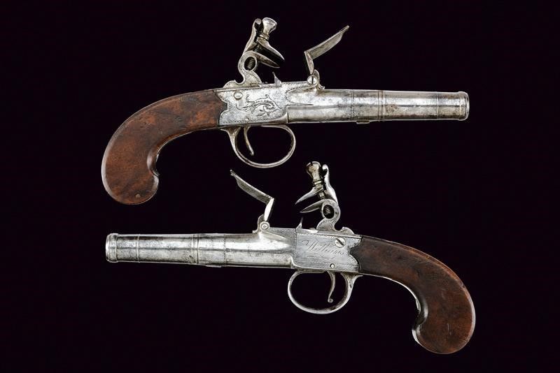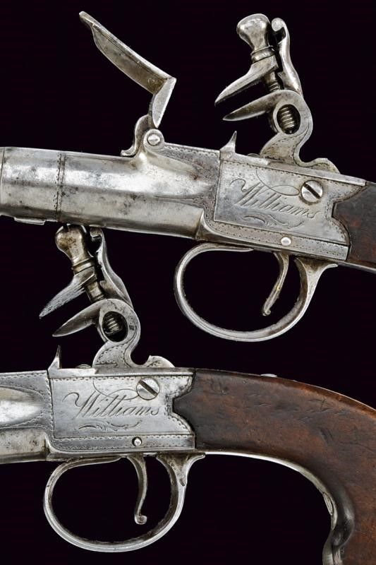 Inghilterra, lunghezza 20,2 cm. fine del XVIII Sec. Canne tonde lisce, del tipo svitabile (bloccate), munite di anellature sottili e gioia di bocca in volata, cal. 10,9 mm. Castelli boxlock firmati 'Williams'. Punzoni di Birmingham sul lato inferiore. Calci lisci in legno Meccaniche funzionanti ma da rivedere.
