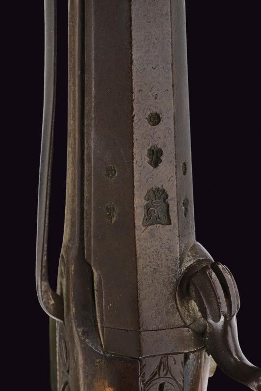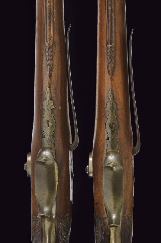 Italia meridionale, lunghezza 35 cm. Metà del XIX Secolo Belle canne in damasco a due ordini con cornicette al cambio, recanti marche e punzoni sulle camere di scoppio, lunghe codette parzialmente incise a fiorame. Batterie a molla indietro incise al bulino con uccelli e volute (una cresta di un cane con mancanza). Casse intere in noce italiano con impugnatura zigrinata (una con vecchio restauro). Fornimenti in ottone comprendenti contropiastre, fascette reggicanna, ponticelli con appoggi e cassettine con coperchi a conchiglia incassati. Ganci da cintura in ferro, una bacchetta originale in ferro.