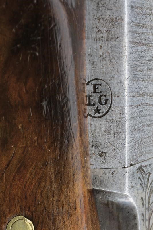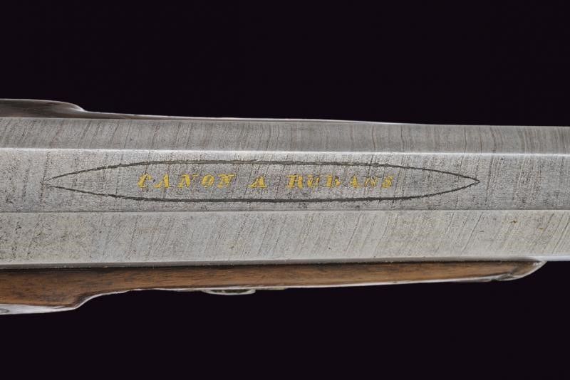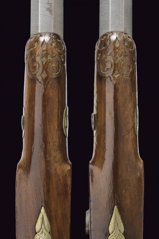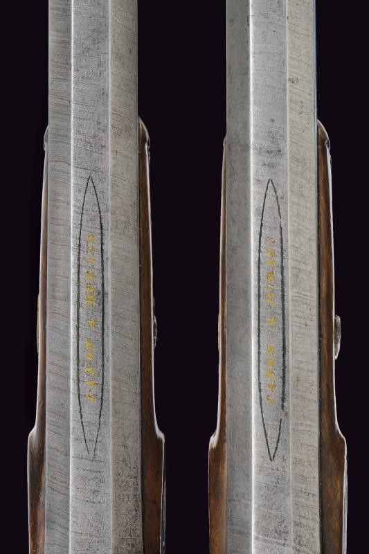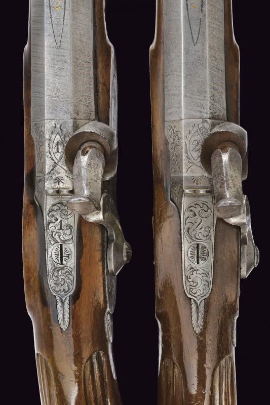 Metà del XIX Secolo Canne ottagonali rigate (anime con pitting, rigature ben visibili), in damasco, marcate 'CANON A RUBANS' in oro, recanti sul lato sinistro il punzone del banco di prova di Liegi, dotate di mirino di precisione, cal. 13 mm. Le basi incise e numerate '1' e '2'. Codette numerate ed incise en suite, dotate di alzo. Batterie a molla in avanti decorate a motivi floreali e raggi. Casse a tre quarti in legno con muso scolpito e calcio scanalati. Fornimenti in ottone inciso. Ponticelli con poggiadito. Stecher. Una pistola con meccanica da rivedere. Nella loro cassetta di legno rivestita all'interno con panno verde, munita di attrezzi. La chiave mancante.