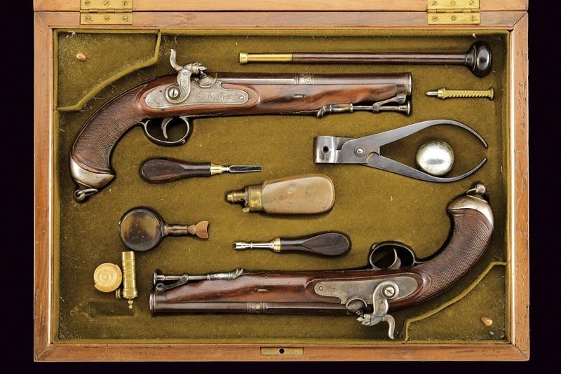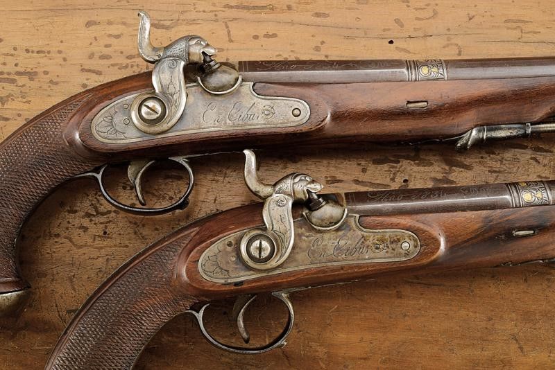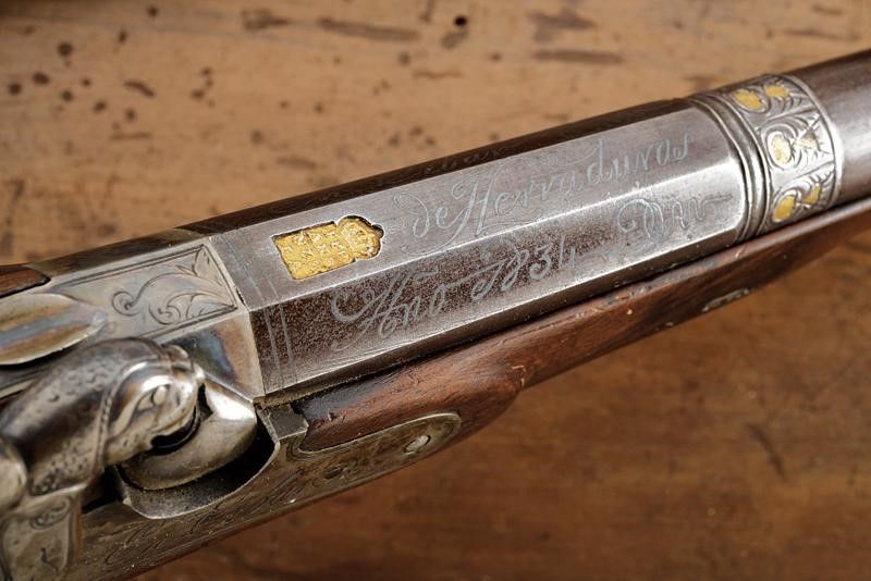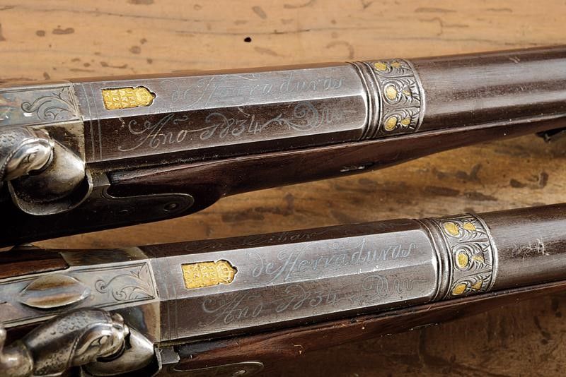 1834 Canne lisce a due ordini, ottagonali e tonde con cornicetta a foglie d'acanto su fondo dorato al cambio. Entrambe le culatte recanti il punzone dorato e coronato 'JPH ARANZETA'. La firma 'De Herraduras/ En Eibar / Año de 1834' su entrambe le canne, rimessa in argento, in tre righe. Volate con gioia di bocca, cal. 17,5 mm. I codoli con traguardo a sella. Batterie a luminello con cane a testa di animale e marcatura 'En Eibar'. Casse intere in legno con impugnatura zigrinata. Fornimenti in ferro, cocce con anello porta correggiolo, bacchette a snodo in ferro. Conservate in una vecchia cassetta rifoderata, dotata di alcuni accessori.