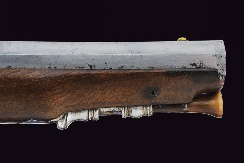 Francia, lunghezza 35 cm. primo quarto del XIX Sec. Canne ottagonali lisce, con volate leggermente strombate, mirini in ottone, cal. 18 mm. Codette con triplice traguardo. Batterie a pietra focaia con cartella liscia e bordi obliqui, piccole codette; una con meccanica da rivedere. Casse intere in legno con calcio zigrinato (piccole mancanze). Fornimenti lisci in ferro. Bacchette in legno con battipalla in corno, una con cavastracci in ferro.