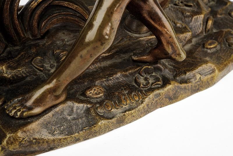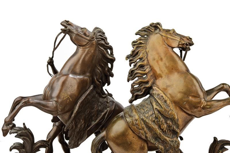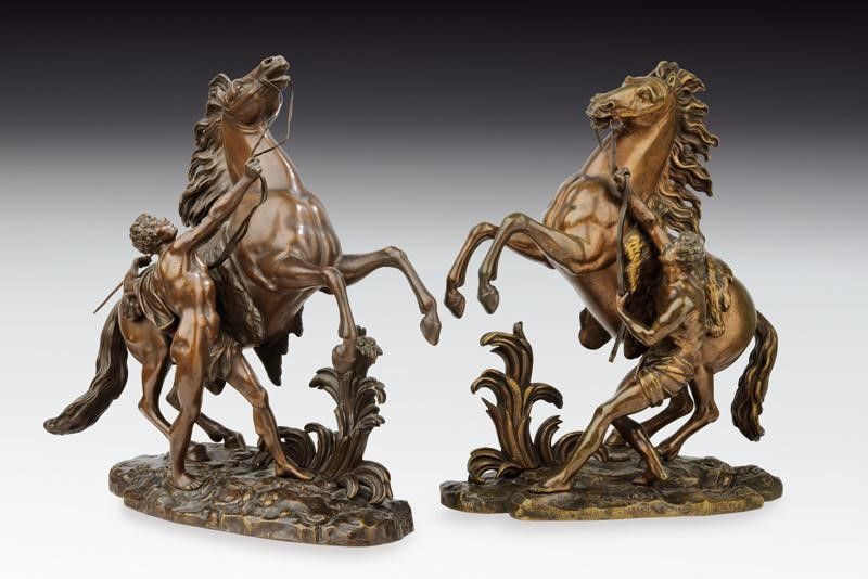 Francia, altezza 41 cm. 1900 circa In bronzo. Bei gruppi scultorei effigianti entrambi un ragazzo, velato di un solo drappo, intento a domare un cavallo; il destriero imbizzarrito, adornato di tutti i finimenti, viene trattenuto a stento per le briglie. Ambedue posti su base in bronzo lavorata a motivi floreali, con firma 'Coustou'.