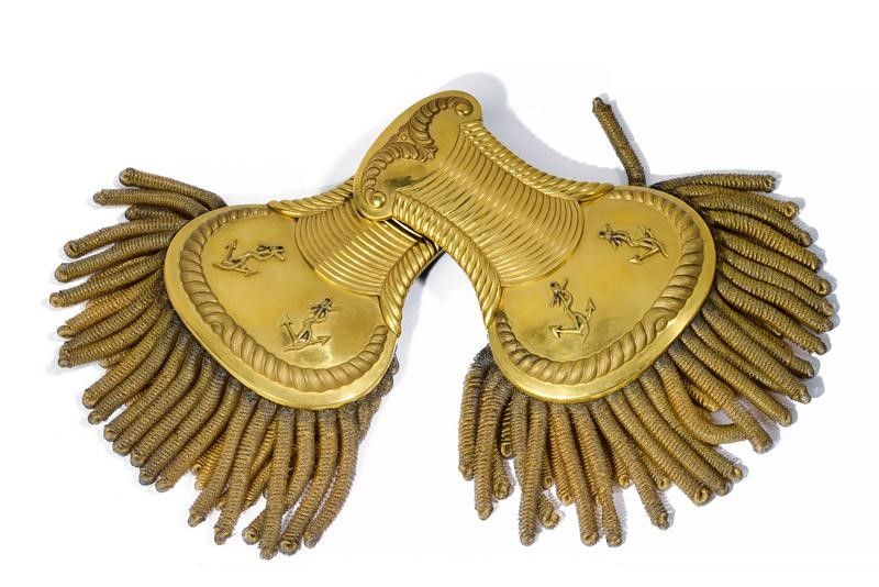 Il metallo dorato e con frange in canutiglia. Nei campi due ancore con cima. Foderate in panno blu scuro sul lato inferiore. Raro.
