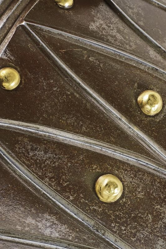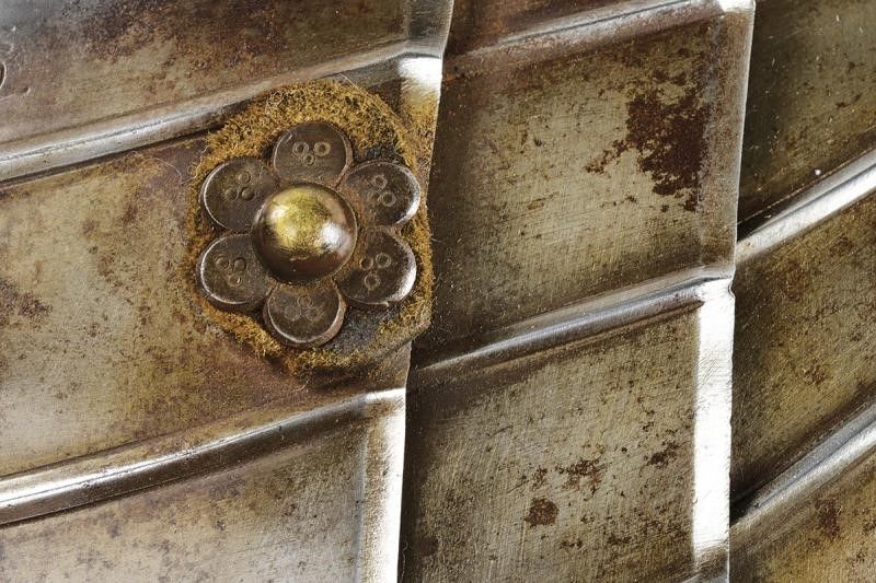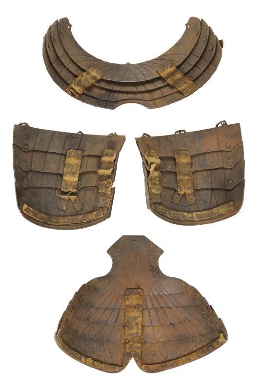 Germania, dimensioni various cm. 1700 circa Pesanti lastre in ferro decorate a nervature. La parte bassa della schiena realizzata in cinque lame, l'ultima con margine ribassato munito di rivetti in ottone e bordo lavorato a fingere il tortiglione (41 x 35 cm). Quattro lame di panziera decorate en suite, la piastra inferiore con rivetti a fiore (41.5 x 13.5). Infine un paio di scarselle a quattro lame, ognuna con tre fibbie per il fissaggio (27.5 x 24). All'interno coietti. Molto rare.