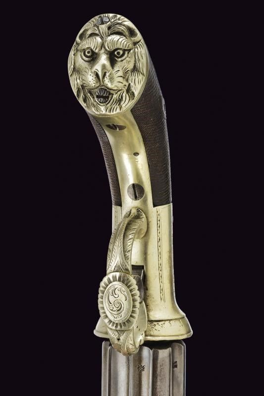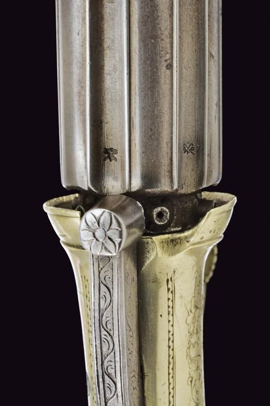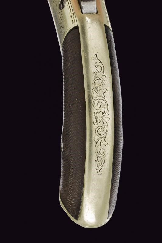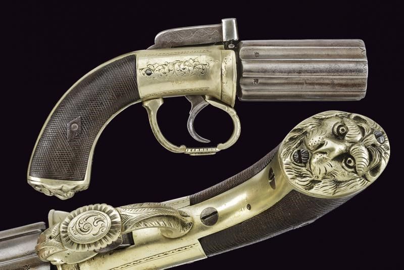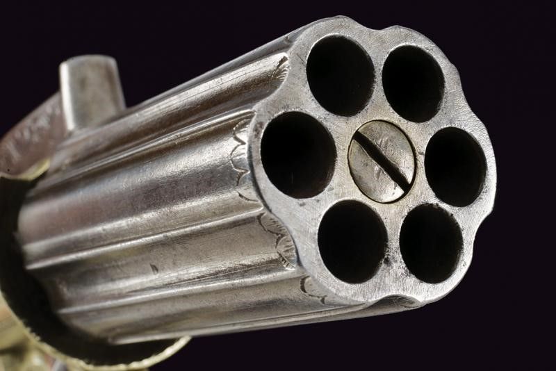 Londra, lunghezza 21.2 cm. 1855 circa Gruppo tamburo-canne a sei colpi, scanalato, inciso alla volata e con punzoni del banco di prova di Birmingham, cal. 9 mm. Castello di sezione ovale in metallo bianco firmato 'D. EGG LONDON'. Il cane inciso, con percussione dorsale. Guancette in legno microzigrinato. Fornimenti in metallo bianco, ponticello inciso a motivi floreali e geometrici, il pomo a testa di leone in rilievo. Meccanica funzionate.