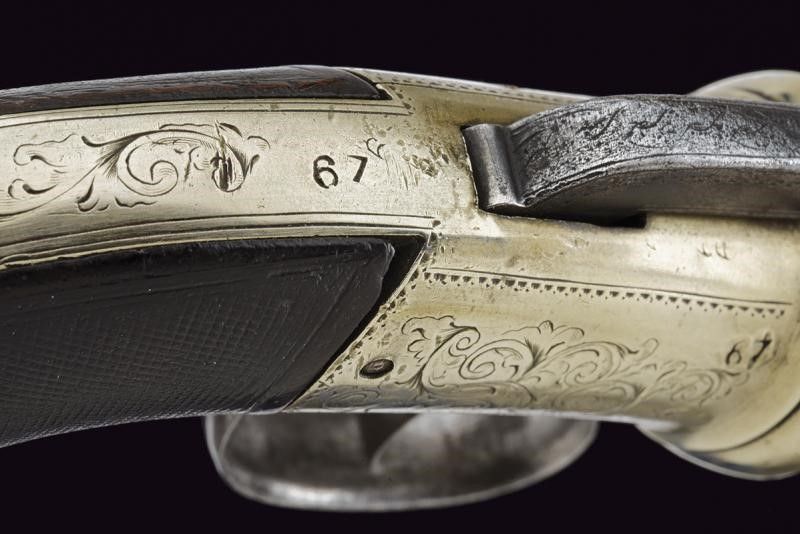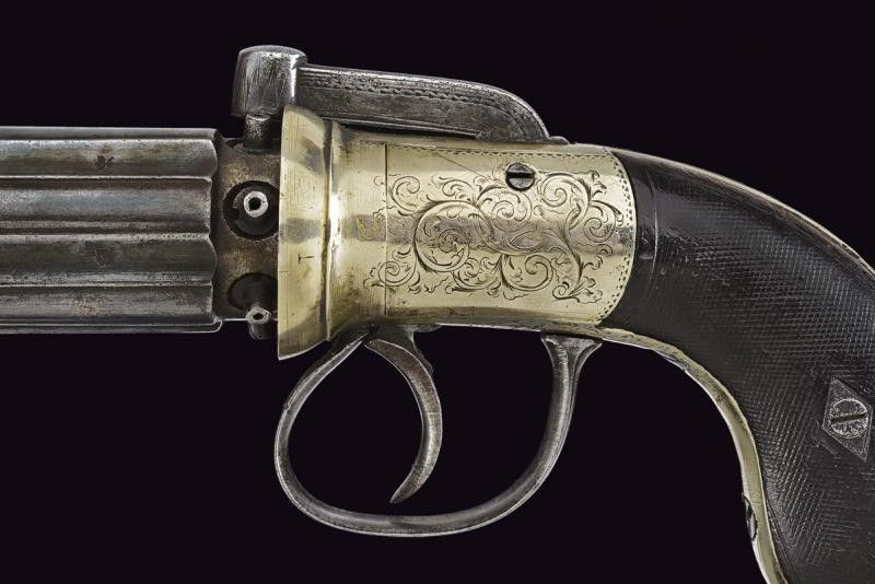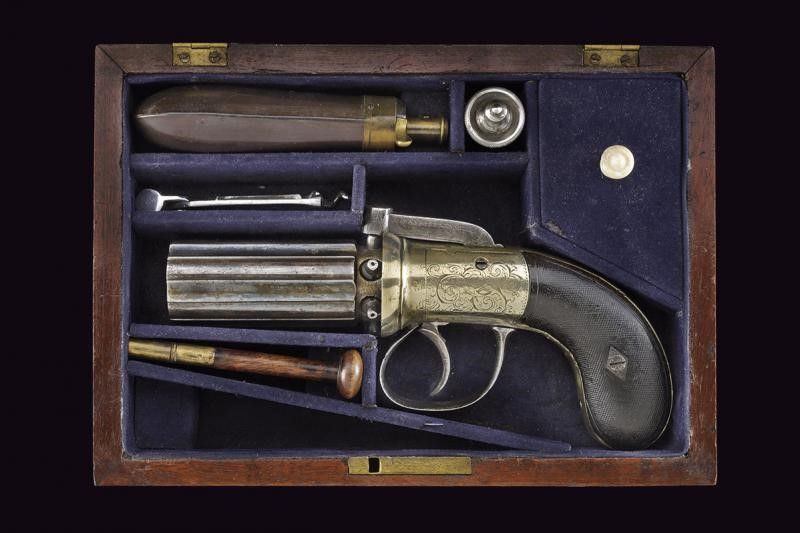 Londra, lunghezza 19.5 cm. 1855 circa Gruppo tamburo-canne scanalato, a sei colpi con punzone del banco di prova; castello di sezione ovale inciso a volute, guancette in legno zigrinato, la cornice marcata 'MANTON LONDON'; cal. 8 mm. Ponticello in ferro. Nella sua cassetta di legno foderata internamente in panno viola scuro, con alcuni accessori, etichetta di Manton e chiave.