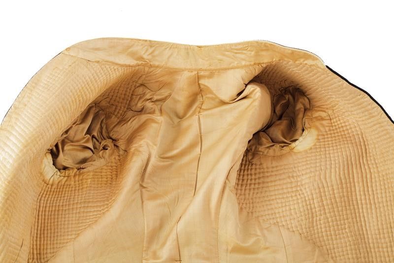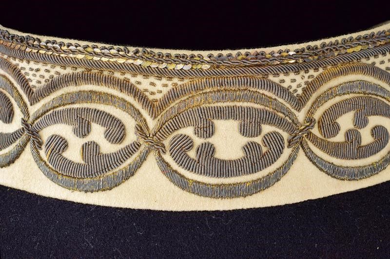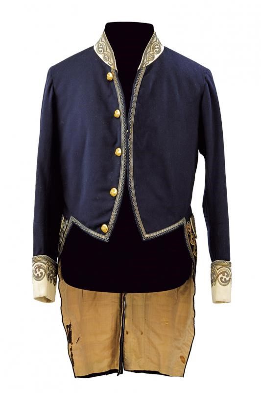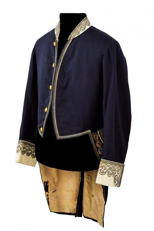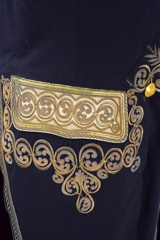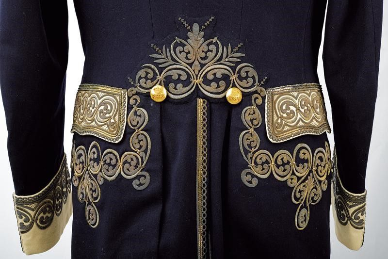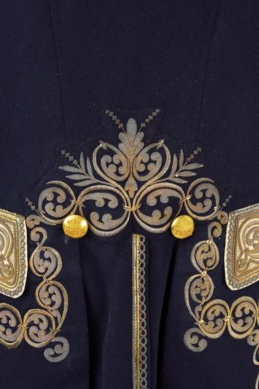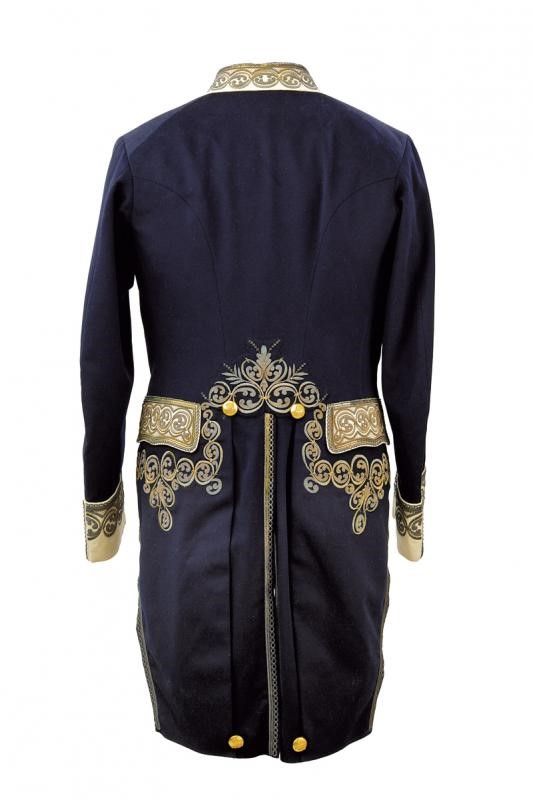 Regno di Sardegna, altezza 100 cm. Prima metà del XIX Secolo Marsina da diplomatico, in tessuto blu con colletto, polsini e tasche bianchi, riccamente decorata in canutiglia dorata (brunitura) a motivi geometrici e floreali. Bottoni dorati con motto 'FERT'. L'interno in seta bianca. Piccoli danni e segni d'uso.