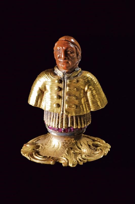 XVIII Secolo La testa in corno, con busto e base in oro giallo, sotto all'erma un anello di piccoli rubini (due mancanti). Bellissimo lavoro. Peso totale 15 g.