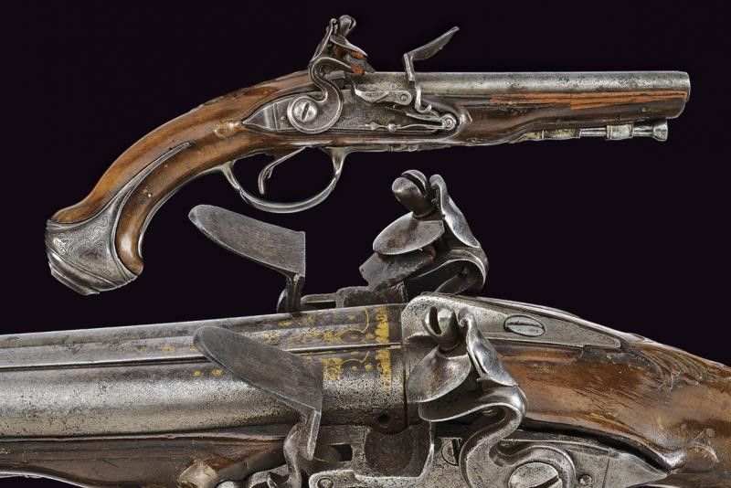 Francia, lunghezza 28 cm. 1800 circa Canne lisce, tonde, giustapposte, con bindella e base incisa e dorata a motivi floreali, cal. 10 mm. Batterie a pietra focaia con cartelle piatte (meccanica da rivedere). Cassa intera in legno (piccoli restauri) con fornimenti in ferro incisi a motivi floreali. Bacchetta in ferro.