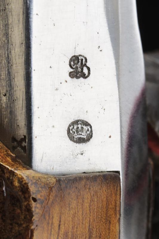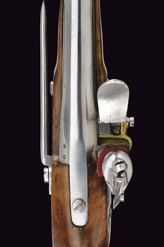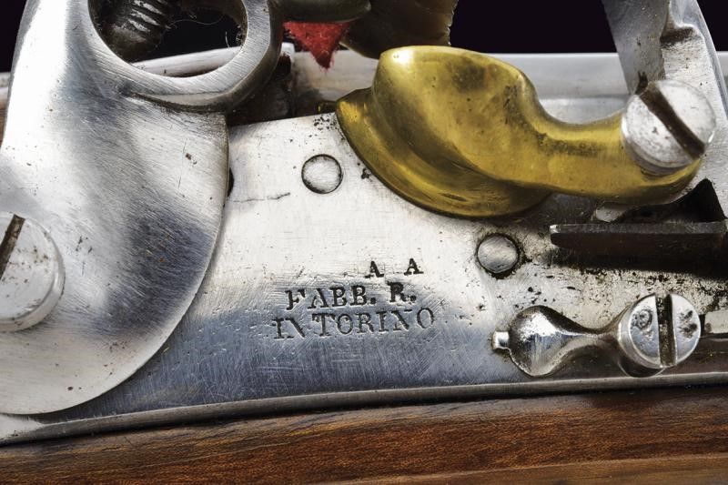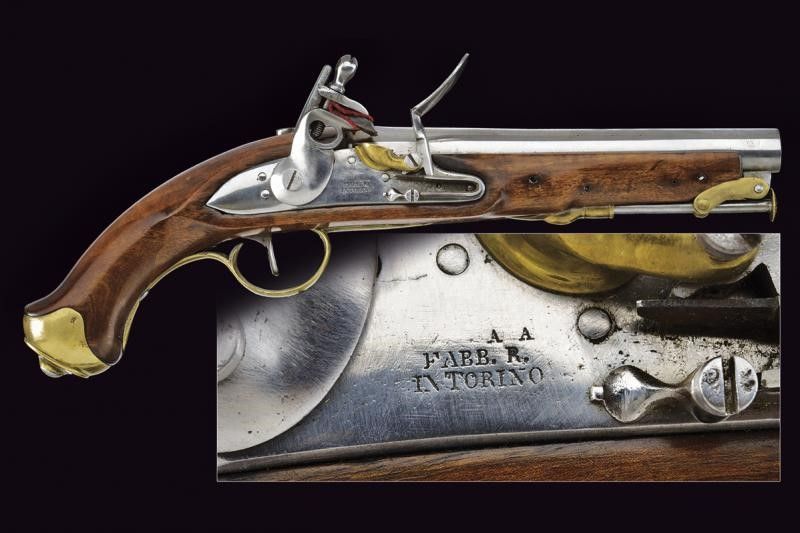 Torino, lunghezza 36 cm. Prima metà del XIX Secolo Canna tonda, liscia con base ottagonale munita di due punzoni, cal. 17 mm; batteria a pietra focaia con cartella marcata 'FABB.A R.A IN TORINO', scodellino in ottone. Cassa intera in legno con timbri piemontesi e fornimenti ottone; gancio da cintura e baionetta a snodo in ferro. Rara.