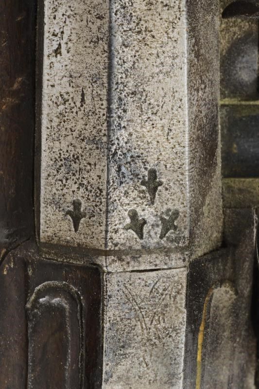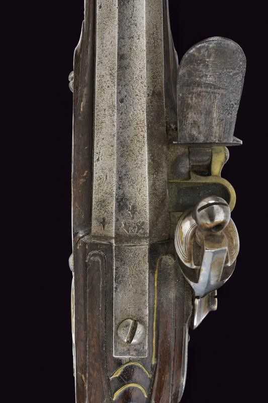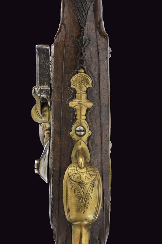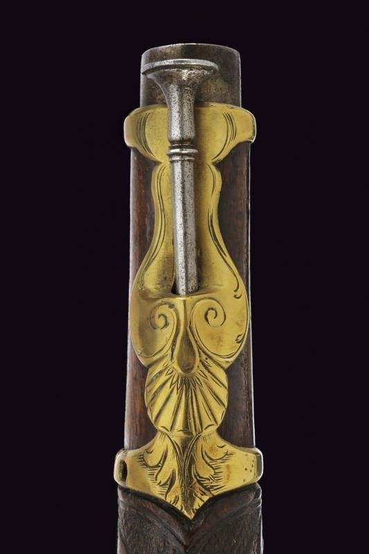 Italia meridionale, lunghezza 34 cm. 1800 circa Canna liscia a due ordini, prima ottagonale, con gigli alla base, poi, tonda, con anellatura al cambio e in calibro 17 mm. Batteria a pietra focaia con cartella leggermente incisa, cane alla francese e scodellino in ottone. Cassa intera in legno lievemente scolpito e con calcio zigrinato a squame. L'area attorno alla batteria decorata a chiodini. Bei fornimenti in ottone inciso e con contropiastra traforata. Bacchetta in ferro.