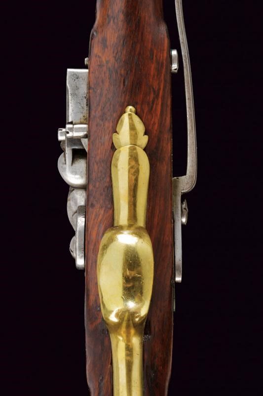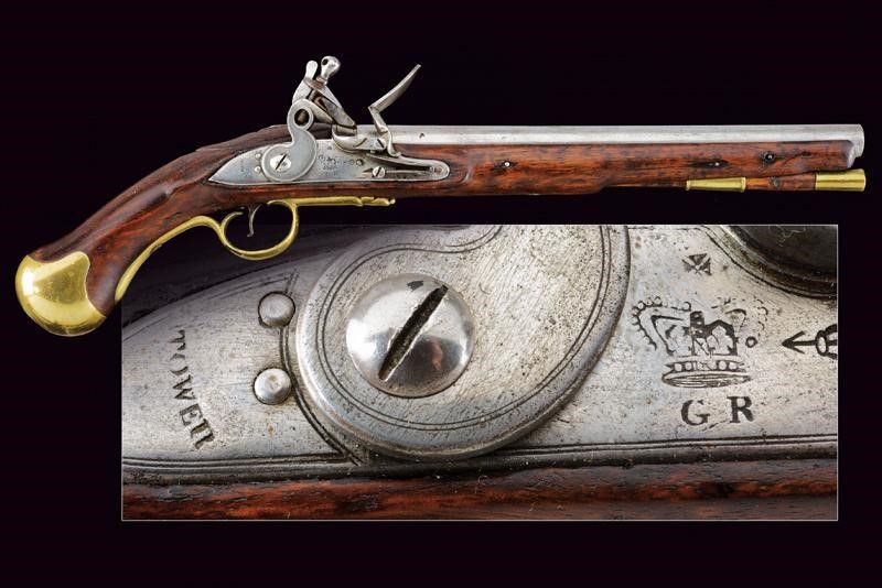 Inghilterra, lunghezza 49 cm. Prima metà del XIX Secolo Canna tonda liscia, con punzoni e anellatura alla culatta, cal. 15 mm; codetta punzonata. Batteria recante monogramma reale 'GR' sotto corona, marcata 'TOWER' e dotata di due punzoni. Cassa intera in legno con fornimenti in ottone. Gancio da cintura in ferro punzonato. Bacchetta in legno con battipalla in ottone. Rara, soprattutto in queste condizioni.